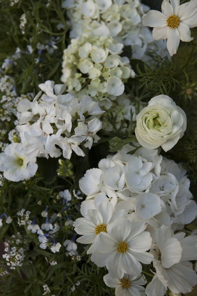 White Hydrangeas, white Ranunculus, White Cosmos, White Lobelia, Ranblin’ White Petunia, white Geraniums, and Silver Stream Alyssum