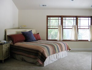 The windows in your room are architecturally interesting and should be featured. Single, long panels mounted at each ends – close to the ceiling, hung on natural iron decorative rods, in either Spa Linen or Chocolate Twill would truly frame your windows. Matching panels on either side of the sliders going out to the deck should hang at the same height as the windows. If privacy is an issue, we would like to see natural bamboo roll-up blinds used on the windows. They should be mounted above the windows.