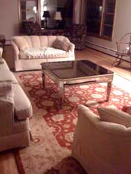 Drapes can make a room appear warmer, and we suggest our Ballard Essential Panels in Caramel Twill. Hanging the drapes close to the ceiling will give the room height and frame the windows. In front of the windows, place 2 Square Louis Side Chairs (with linen finish legs) covered in Ashford Paisley to define that corner of your room. The chairs will also give you the option of pulling them up to the sofa area when extra seating is needed. We think you can leave the existing side table and lamp in between the two chairs.