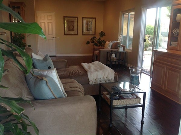 Our flooring and built-in bookcase are new and we have to live with our sofa for a while but we can move the large chair to another room.