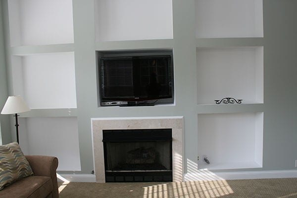 The focal point of the room has eight built-in boxes that surround the gas fireplace.