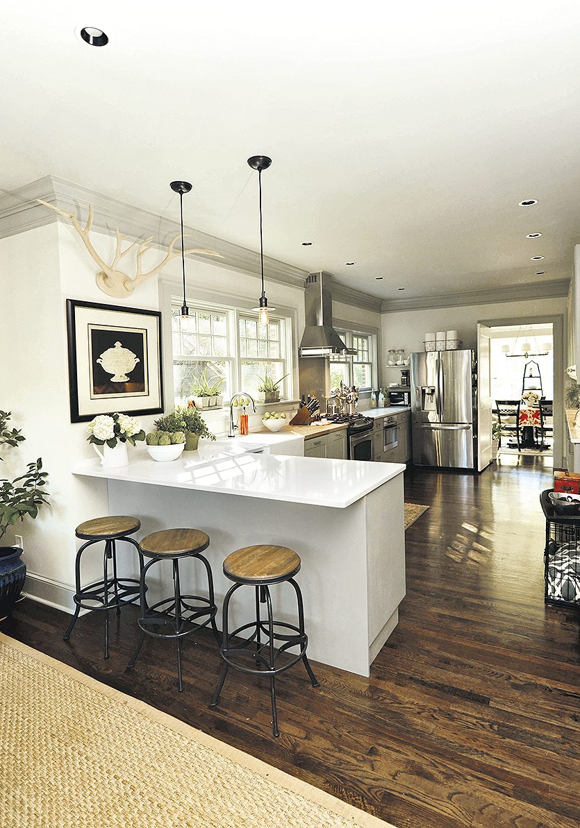 At her new peninsula, Karen used three Allen Stools. Their worn wood seat and black frame nicely contrast the glossy white countertops and soothing gray cabinetry.