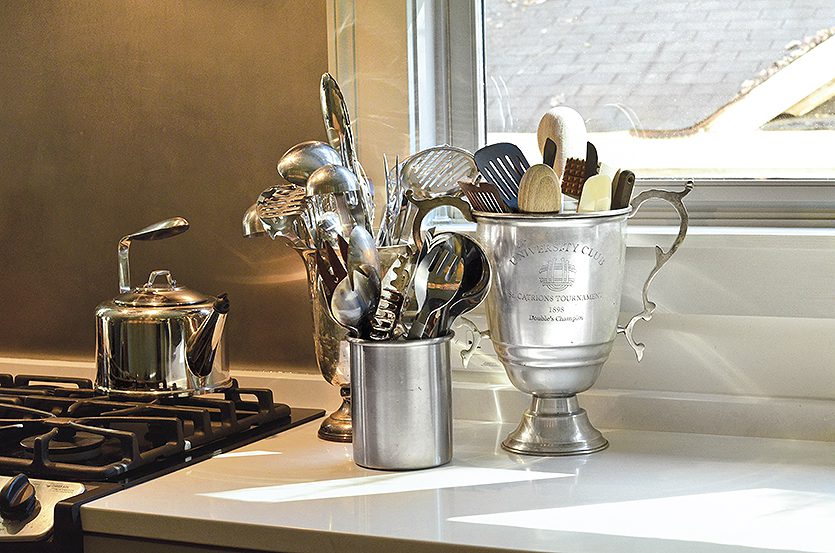 KM: The things that you use every day and keep out—make them cute! Buy the cute one instead of the boring one, you know? Put all of your kitchen spoons and utensils in pretty containers, like these trophies and urns that I use. My spoon rest and the tray that holds my olive oil are pretty. Even my potato brush is cute—it’s a truffle! The pretty planters on the window sill hold succulents, which take no effort to grow. And buy fresh flowers when you go to the grocery store. Everyone should do that.