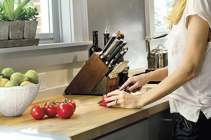 KM: The butcher block square. It’s practical and really cute. It’s right next to the stove where I want to chop and prep. I also like the interruption in the white countertops. I have a pullout trash, which I also love, under the space, so everything can be scraped right into the trash. I love my faucet. You just touch it and it comes on. I thought it was gimmicky at first, but now I can’t live without it! I also love the soft-close cabinets.