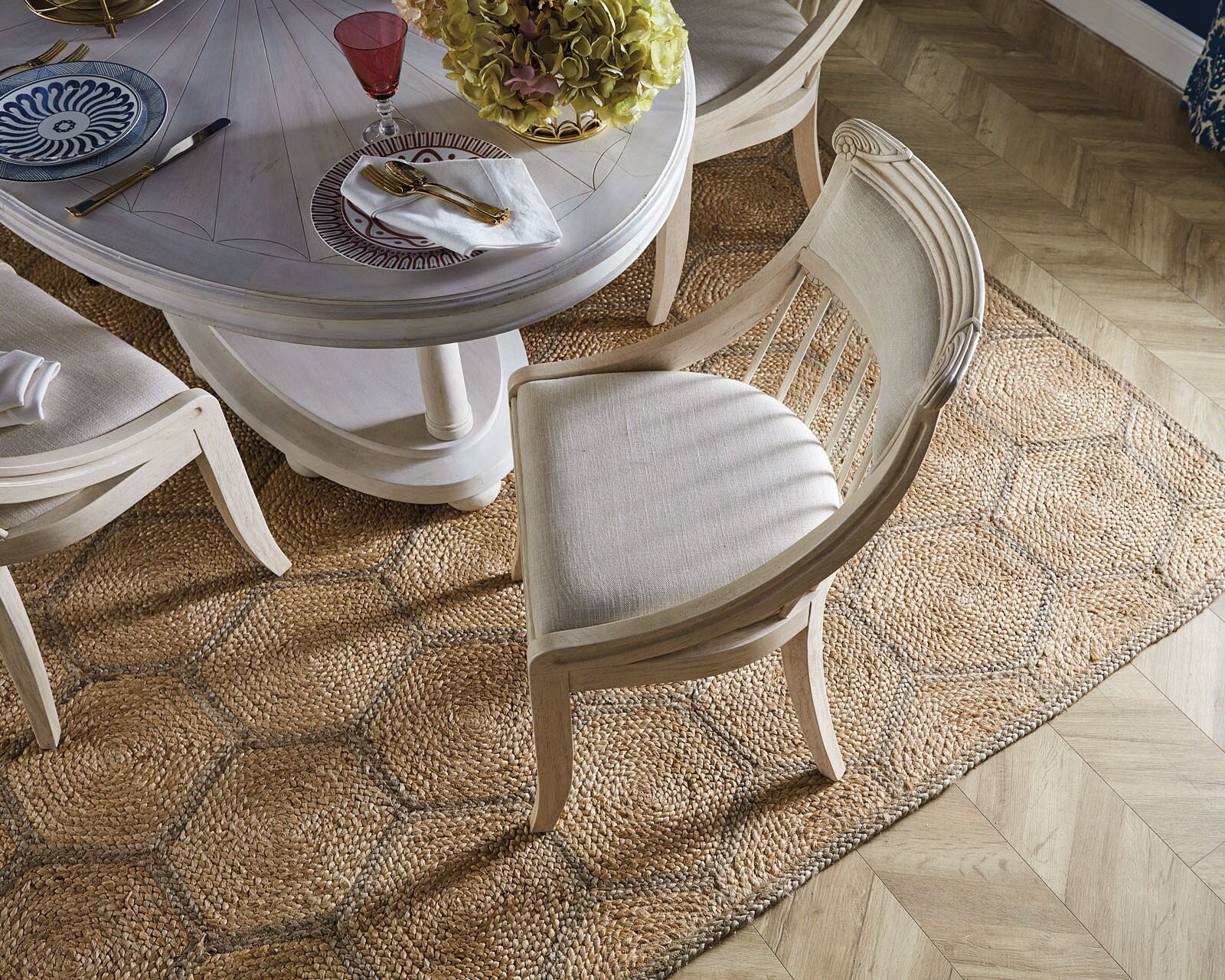 I am redoing my great room and dining room which are open. My taste is traditional with a french country infuence. I am wanting a casual elegant looking room. Will a sisal work well or braided link jute rug? Thanks for your help.