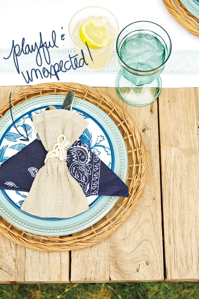 Who says your dinner napkins have to be, well, napkins? We used blue bandanas which are just a dollar a piece at the hardware store! Perfect when you want to incorporate a new color and you don’t want to spend hundreds of dollars on new linens.