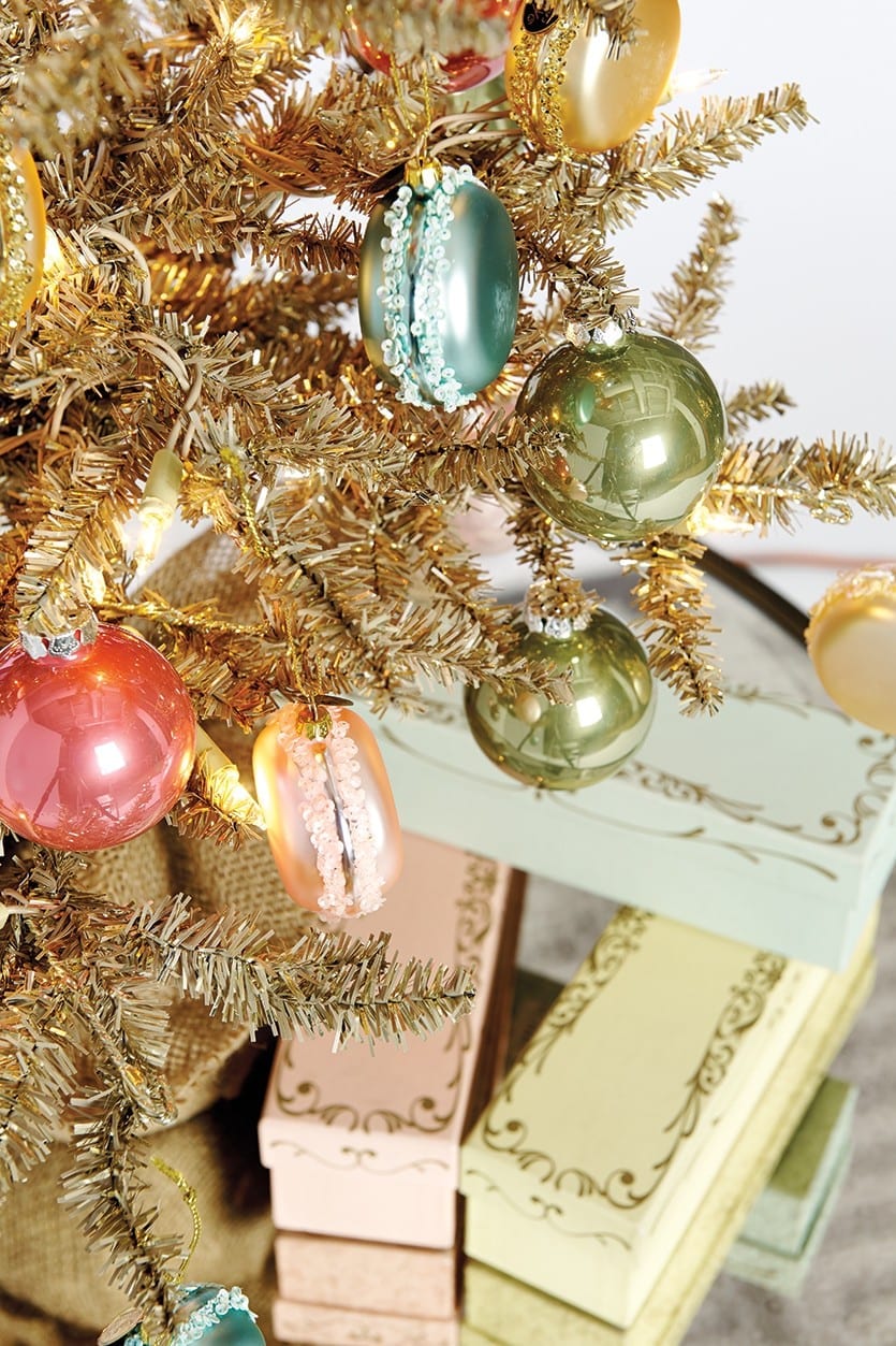 Love the switch! Some years we do “Big Christmas” with all of the trimmings. And some years it’s “Little Christmas” with the more minimal shiny bits. This golden tree with these precious macaroons is just perfect for those “Little Christmas” years.