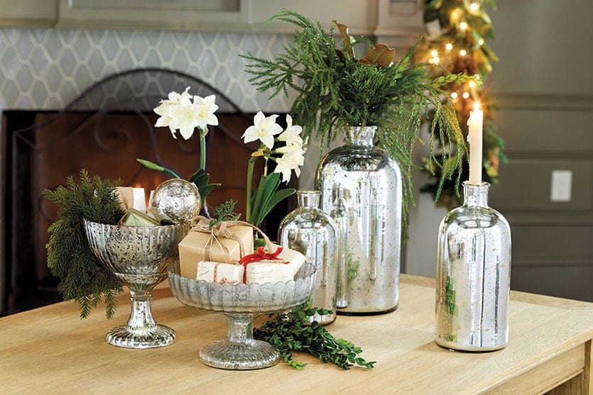 Mercury glass comes in all shapes and sizes and offers the perfect way to amp up your holiday shine. We love to add the glamorous sparkle of mercury glass vases, bowls and candle holders to our mantels and centerpieces during the holidays — and there’s nothing more beautiful simply paired with greenery and white candles. But we say anything that catches and reflects light around the home deserves a place in your decor anytime of year.