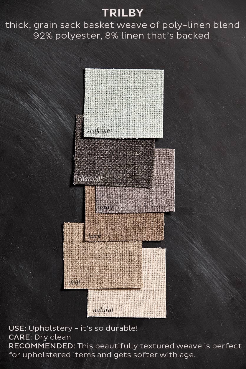 Our Trilby fabrics are at the top of our favorites list because they wear well, they’re backed for extra durability, and they get softer with age. Any of these go-with-anything neutrals will work in your home.