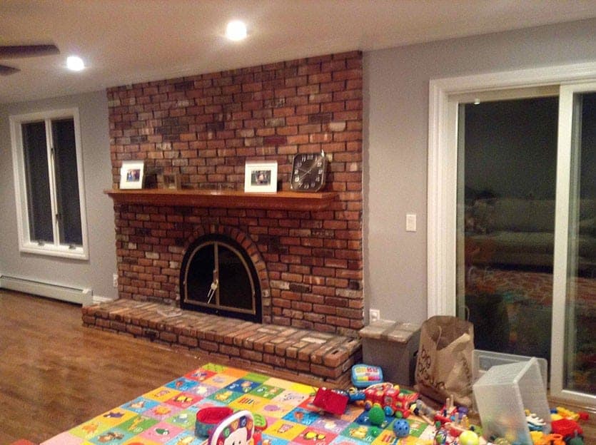 Since your fireplace wall has a slider door and a window, create symmetry by hanging drapery panels just below the crown molding. By framing both openings with the same treatment, your space will feel a bit more unified.