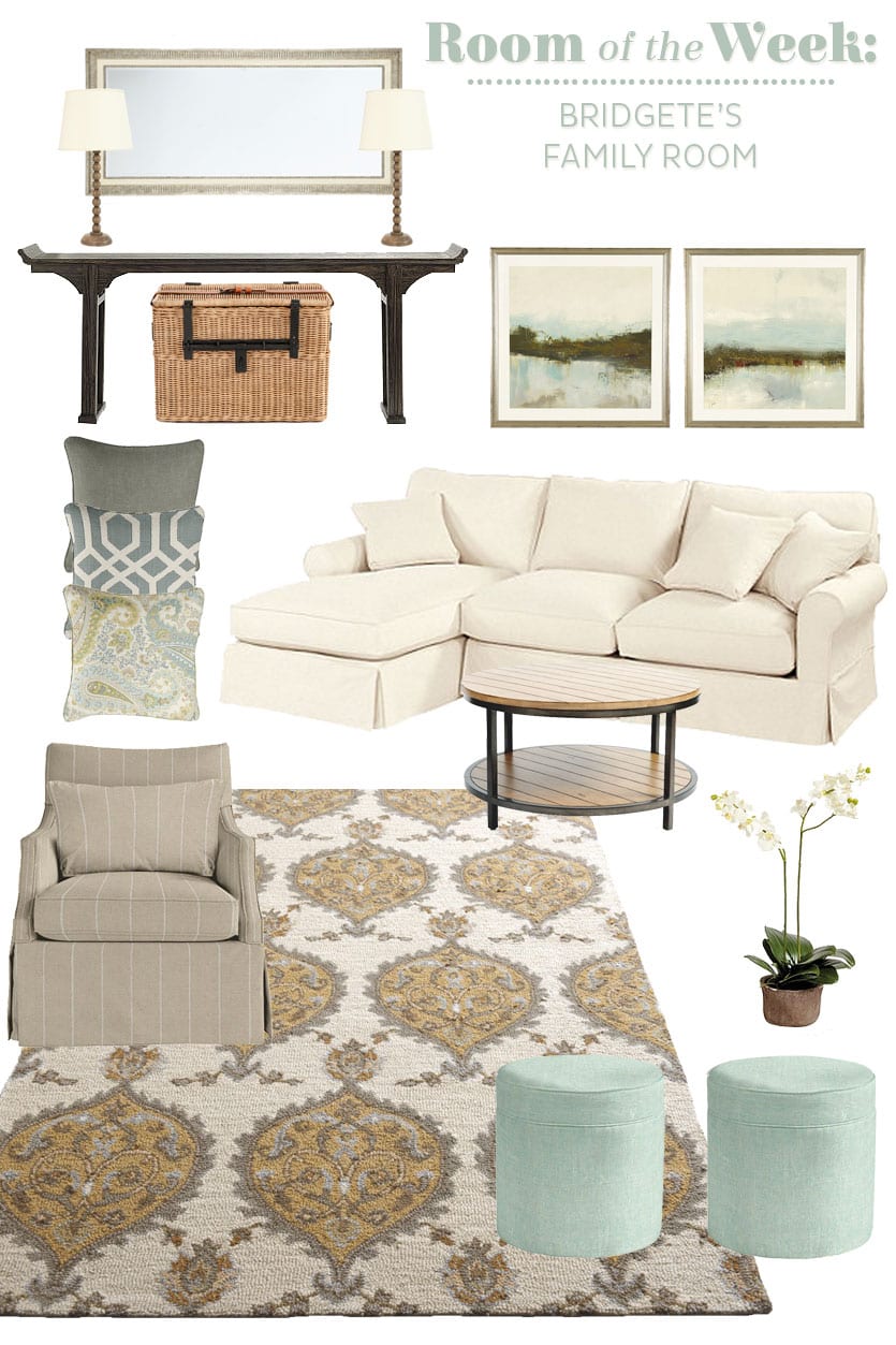 Since your family room is going to set the tone for adjoining rooms, start by painting it a soft, calm color such as Sherwin Williams Rain Washed (SW 6211). We’d also suggest brightening up the room by whitewashing the fireplace. To keep intact your gorgeous view and ample natural light, keep the windows bare of any blinds or curtains.