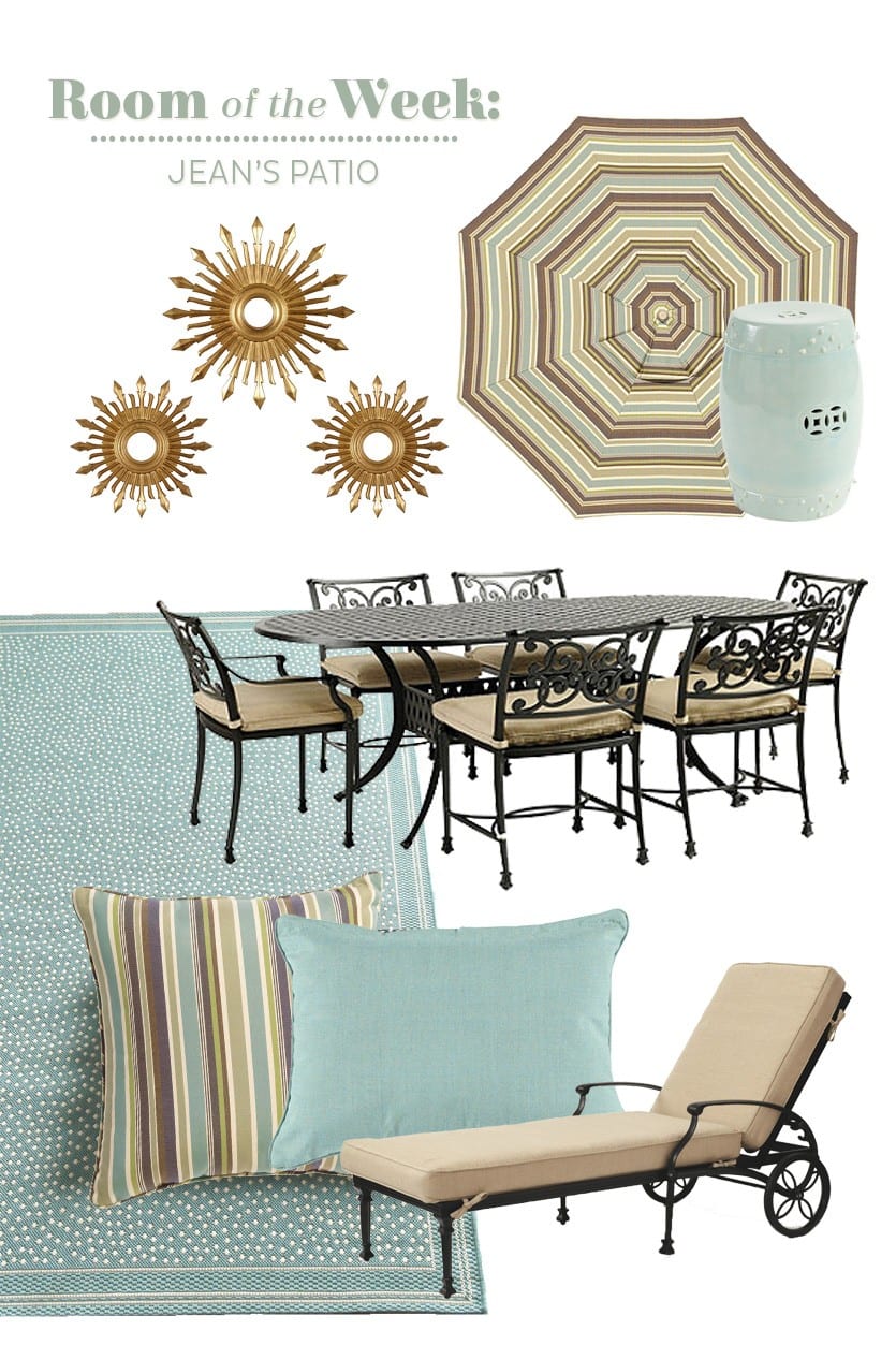You patio space is lovely and very well done! To minimize the complexity of the color palette for the space, we suggest painting your wall the same color as your home. This will keep a simple canvas on which you can add color with textiles, accessories and flowers! There are many different directions you could go with color depending on your preferences, but we pulled together a more serene color story that would tell of relaxation.