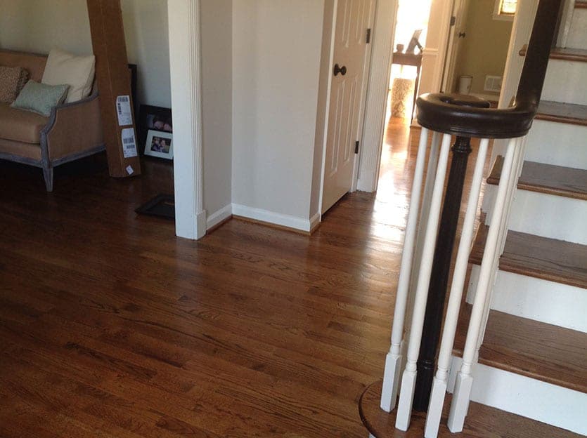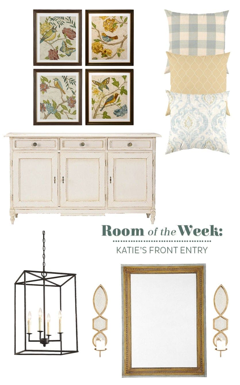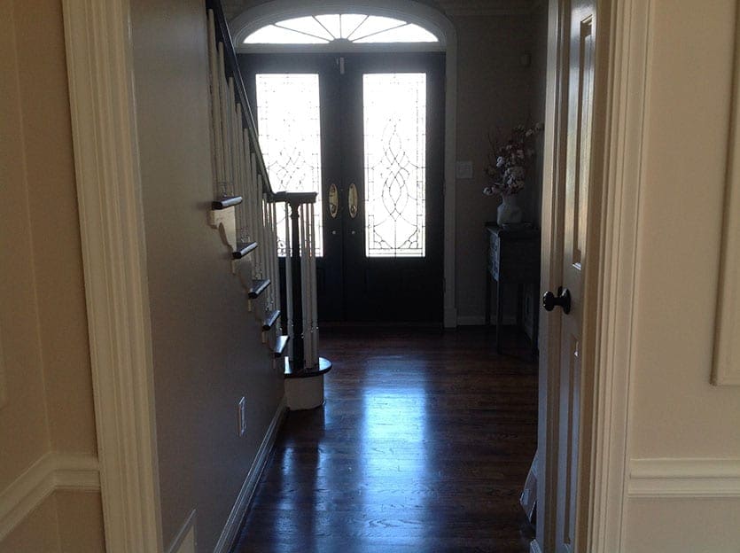 We have a very narrow foyer, and we’re having a hard time pulling it together to make it welcoming. It needs a rug and artwork. To the left of the entry is the formal living room and to the right is the dining room. We also need a larger light, but it cannot be too long because the ceiling is lower where the light hangs!