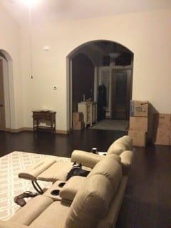 First, we would suggest moving the couch that is under the bank of windows to “float” in the room, directly across from the windows. Moving the couch will define the conversation space in the room. This will also open up a place for some window treatments to shine. Our new Courtney Curtain Panels will look stunning en masse in your large bank of windows. Use one large curtain rod, hung just below the transom windows so that you can hang the 108” panels and just have them touch the floor. The panels will also soften the hard lines within the space.