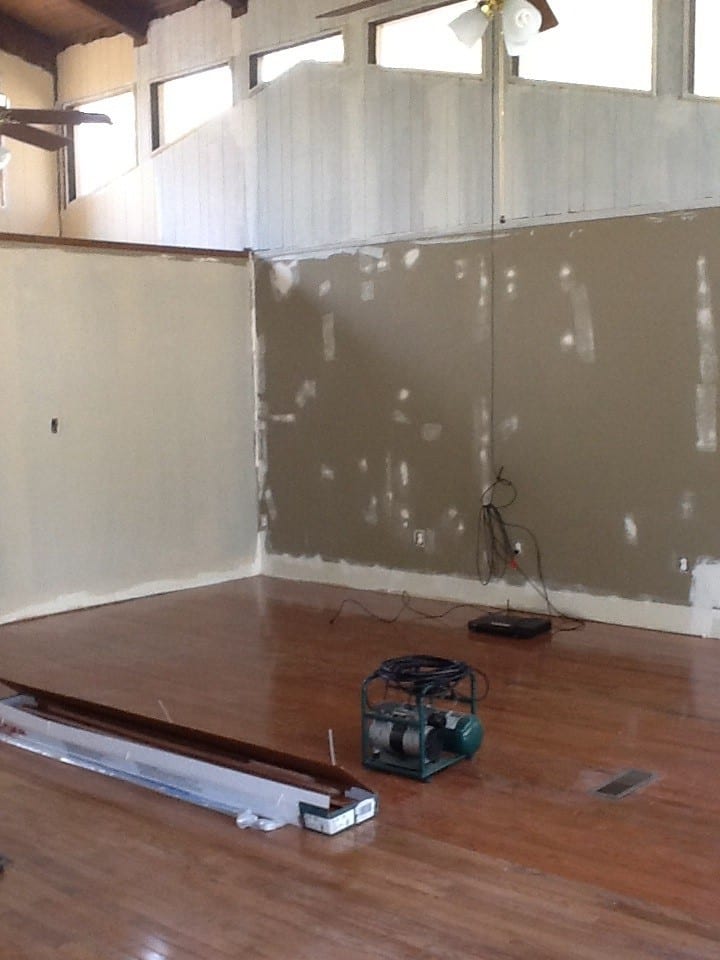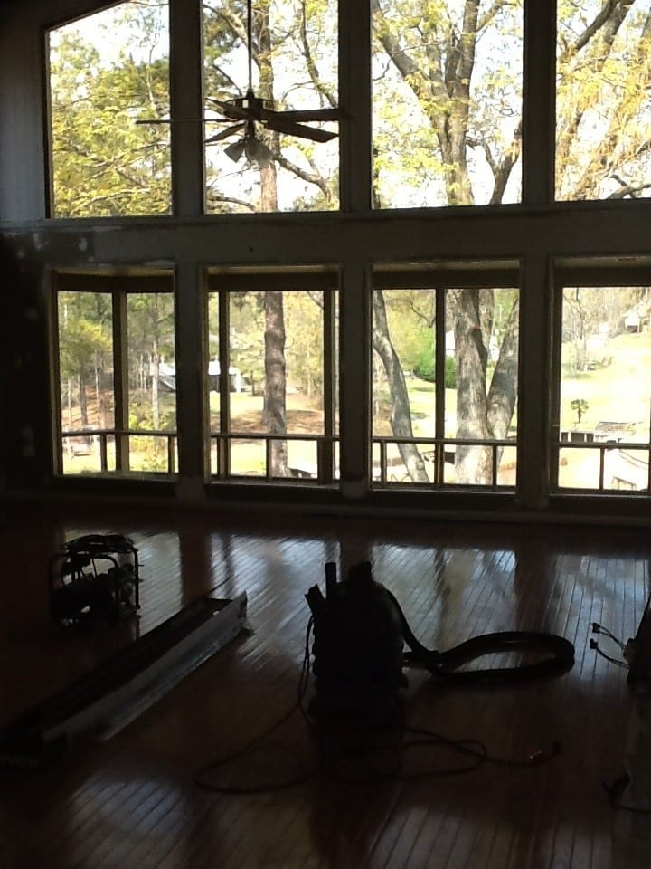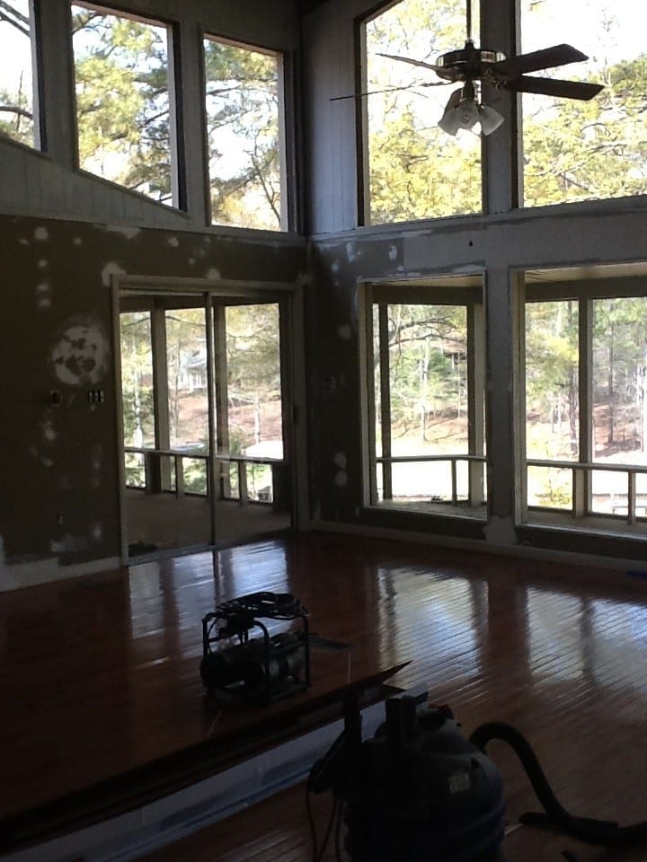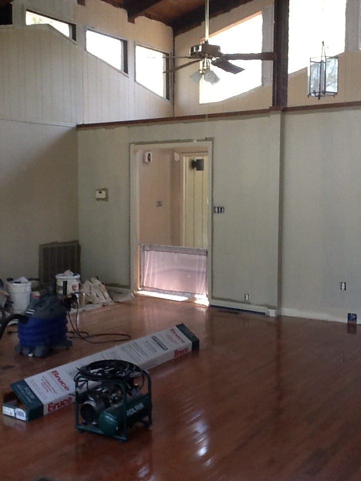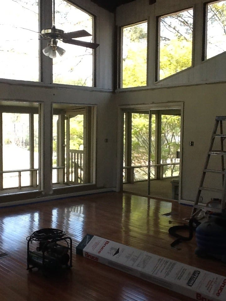 My husband, babies (6 months and 21 months), and I recently moved into a home pursuing our dream of living on the lake. We have a large family room that previous owners had a “stage” in the corner of the room. I call it a stage (have no idea of the original intent or purpose), but it was elevated flooring for some odd reason. My husband just finished the removal and the hard job of laying down hardwoods to match the rest of the room.