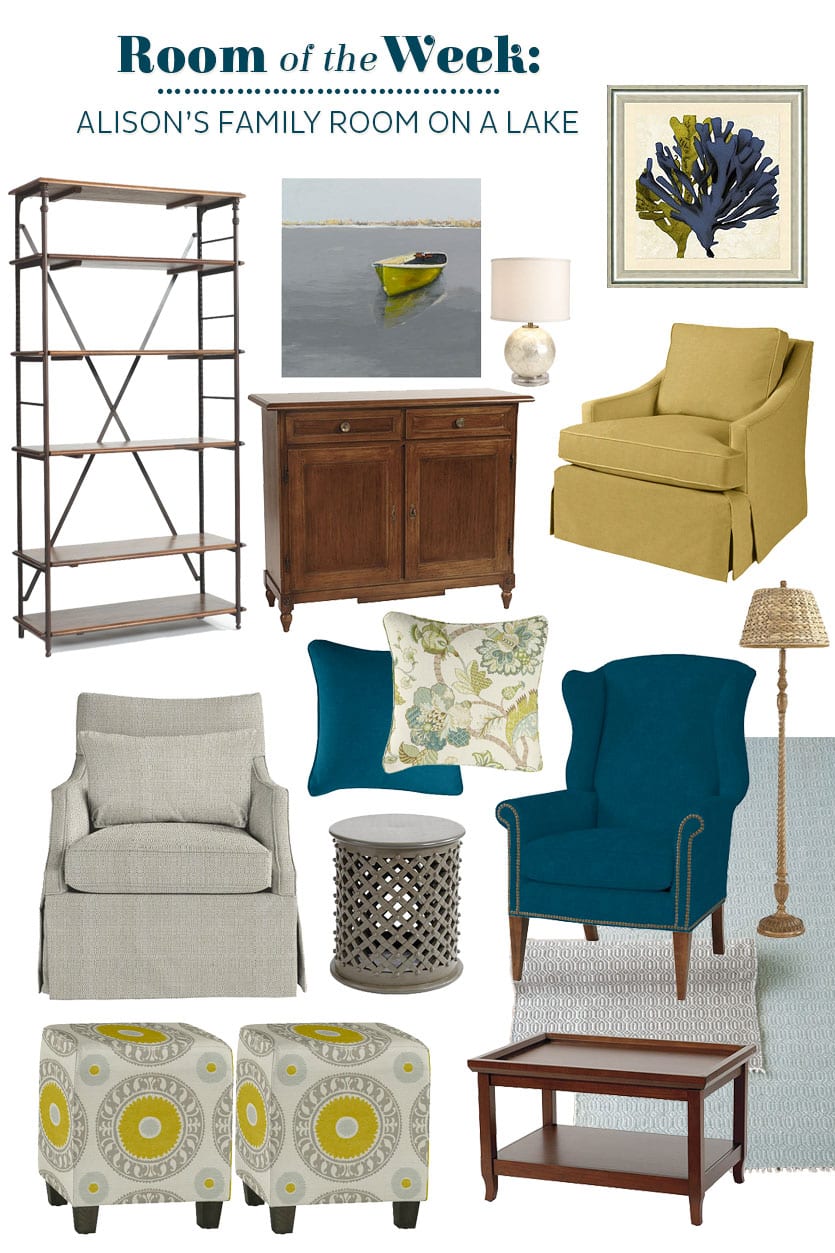 What a fabulous room with a stunning view! Let’s make it amazing by dividing it into several areas, add softness and comfort and bringing the outside in with rich teals, leafy greens, and neutral wood tones.