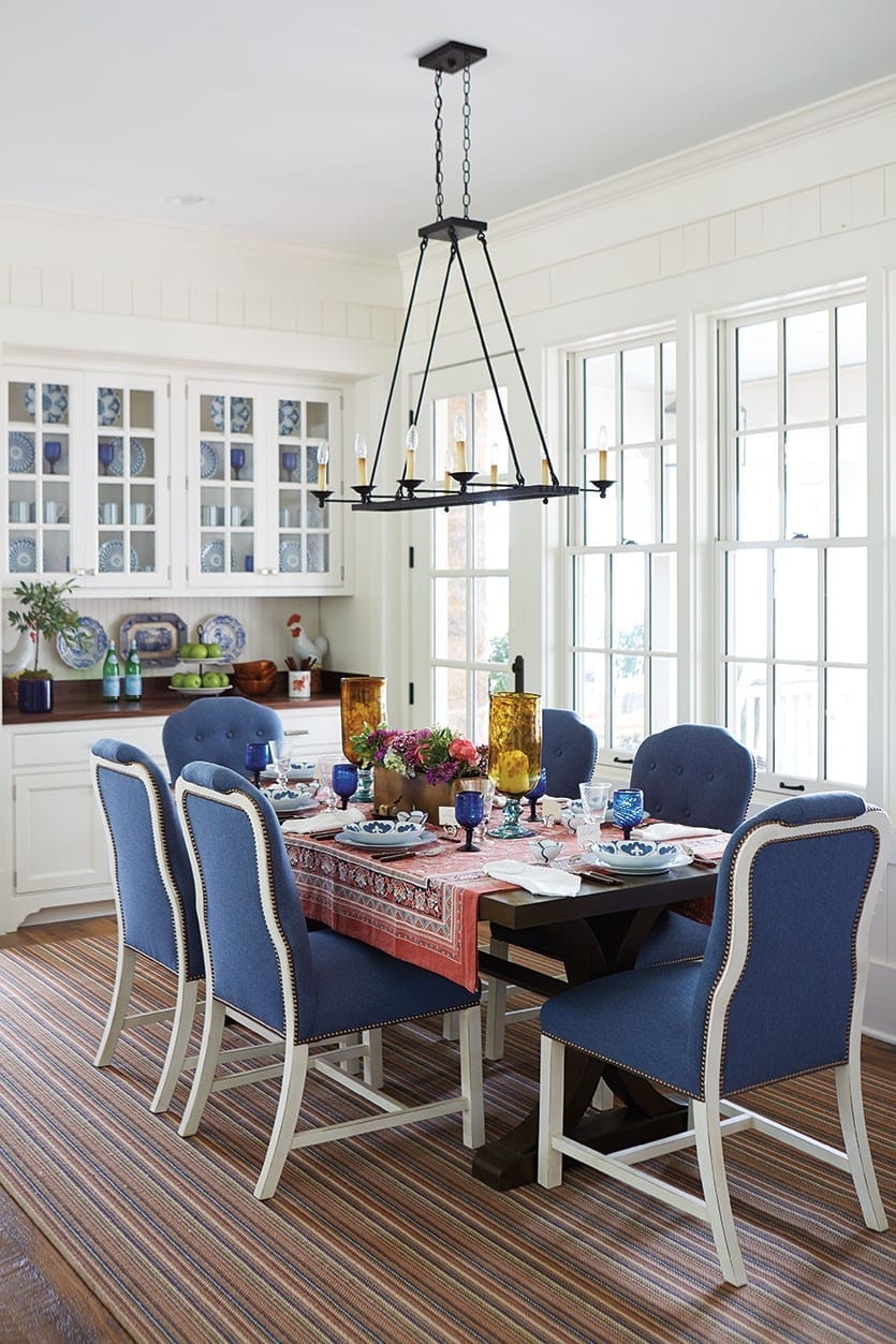 BD: We love the blue and white statement you’ve made with your Campbell House Dinnerware and upholstered chairs.