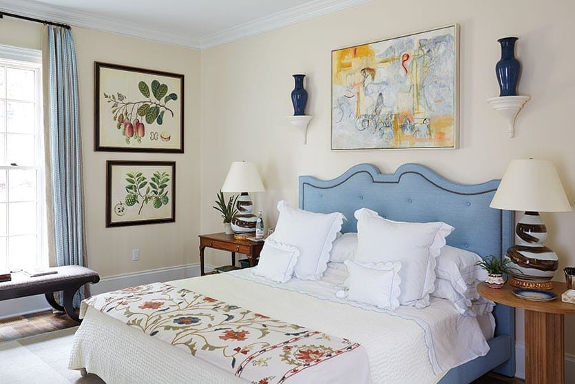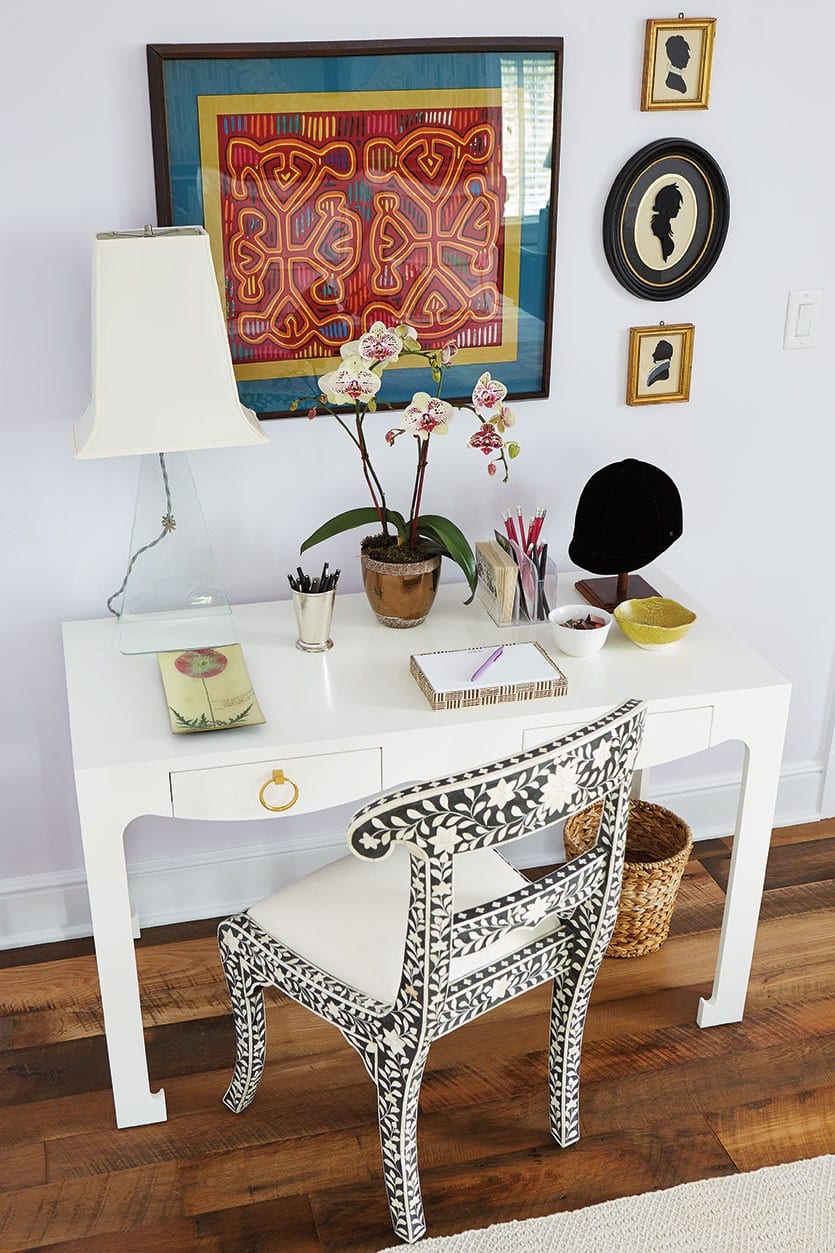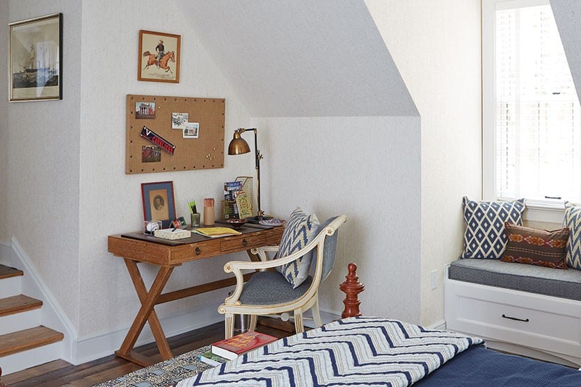 BW: So you really think about what’s needed in a bedroom first. Both rooms have a desk. And you need a chest of drawers, you need a mirror over the chest, and you need benches at the foot of the bed to put luggage on. Both also have window seats. The color palette and details come later. The boy’s room has this smart blue-and-white palette with a hand-blocked Indian quilt over the rattan bed. The round shape of the mirror breaks up the width of the bed and creates a pretty reflection.