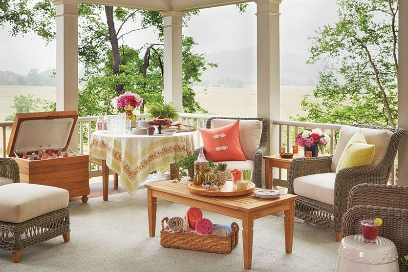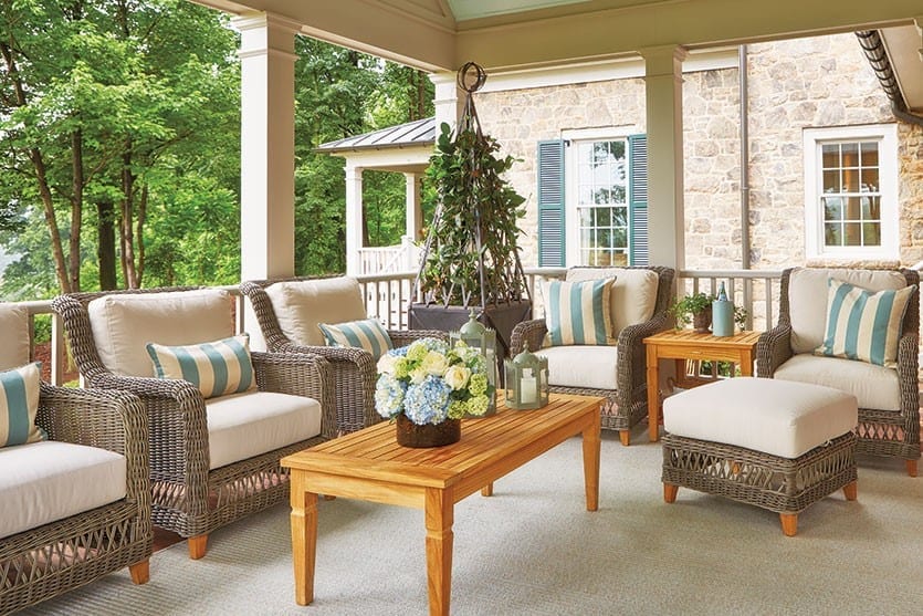BW: The covered porch to me is the sitting area and we’ve loaded it with seating. That woven wicker of the Laurel Collection looks so natural — like twigs and vines formed the furniture. They’re comfortable and weatherproof, which is fantastic. Then you go down the steps to the outdoor area where you have your grill and dining table and some more seating. You could put your umbrellas down there if it’s a sunny day. That’s where I would grill out and eat, but then I could come up and sit on the covered porch, and on cool nights sit near the fire. Whoever owns this house is going to spend a lot of time outside.