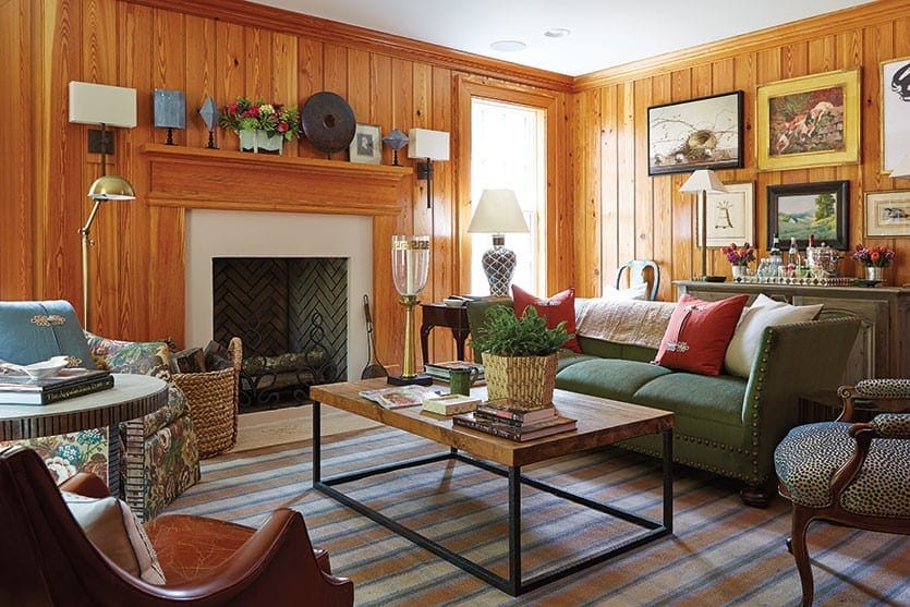 BW: The library, or tavern room, as they call it is a tiny, cozy room. The walls are all wood paneled with Virginia hard pine. It’s got the big screen television in case the husband wants to watch the football game, or you can sit in there at night as a couple and watch a movie. It’s a wonderful nighttime or winter room — and this is what I mean by having different rooms of scale rather than all large rooms or all small rooms. You want to go in them at different times of the day for different reasons.