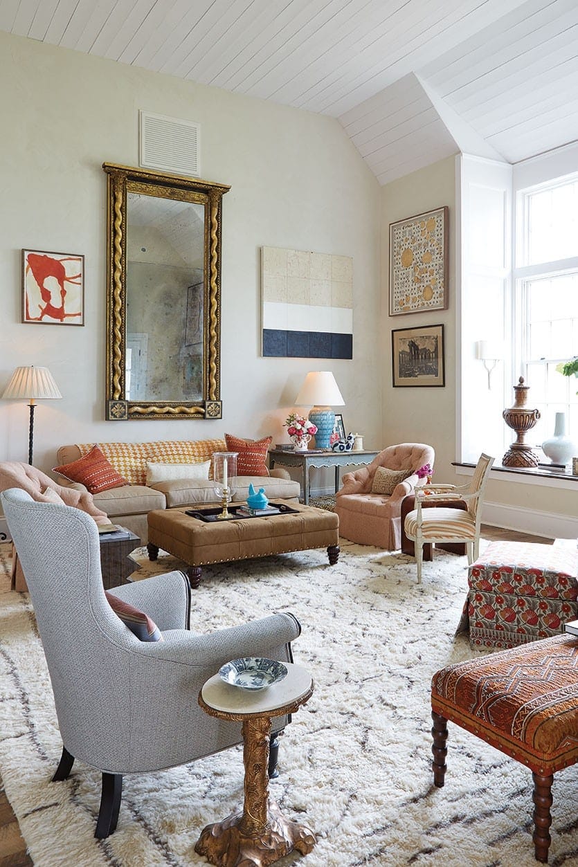 BW: No, the color for me is a subtle color. The walls of the room are natural plaster and the Moroccan rug is neutral. So you have these splashes of color instead of oversaturated colors, and I don’t think you get tired of it as much. There’s a little bit of orange, and a very pretty print on the chair that has some orange and green in it. And, frankly, if you do get tired of it, it’s easy to change. If you took that chair and the accents out, you’d have a fairly neutral room.