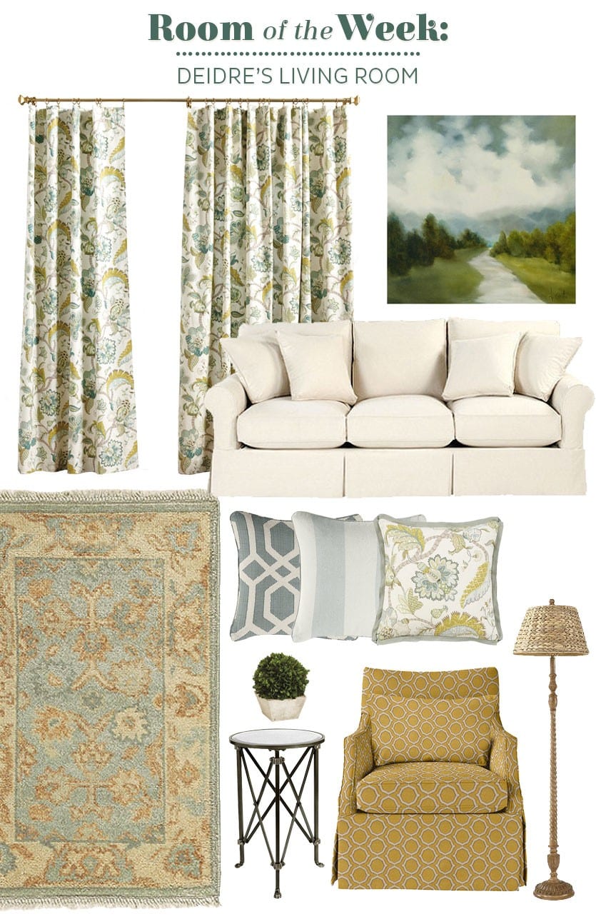 Ground this seating arrangement with the Casa Florentina Everly Rug in an 8x 10. This rug will look fabulous with Courtney Spa Drapery panels hung over the French doors for added color and pattern. The Courtney Spa also comes in a pillows which will work beautifully on the sofa. The Larkin chairs come with two pillows so consider moving those to the sofa and ten add a couple more Courtney Spa pillows to the chairs.