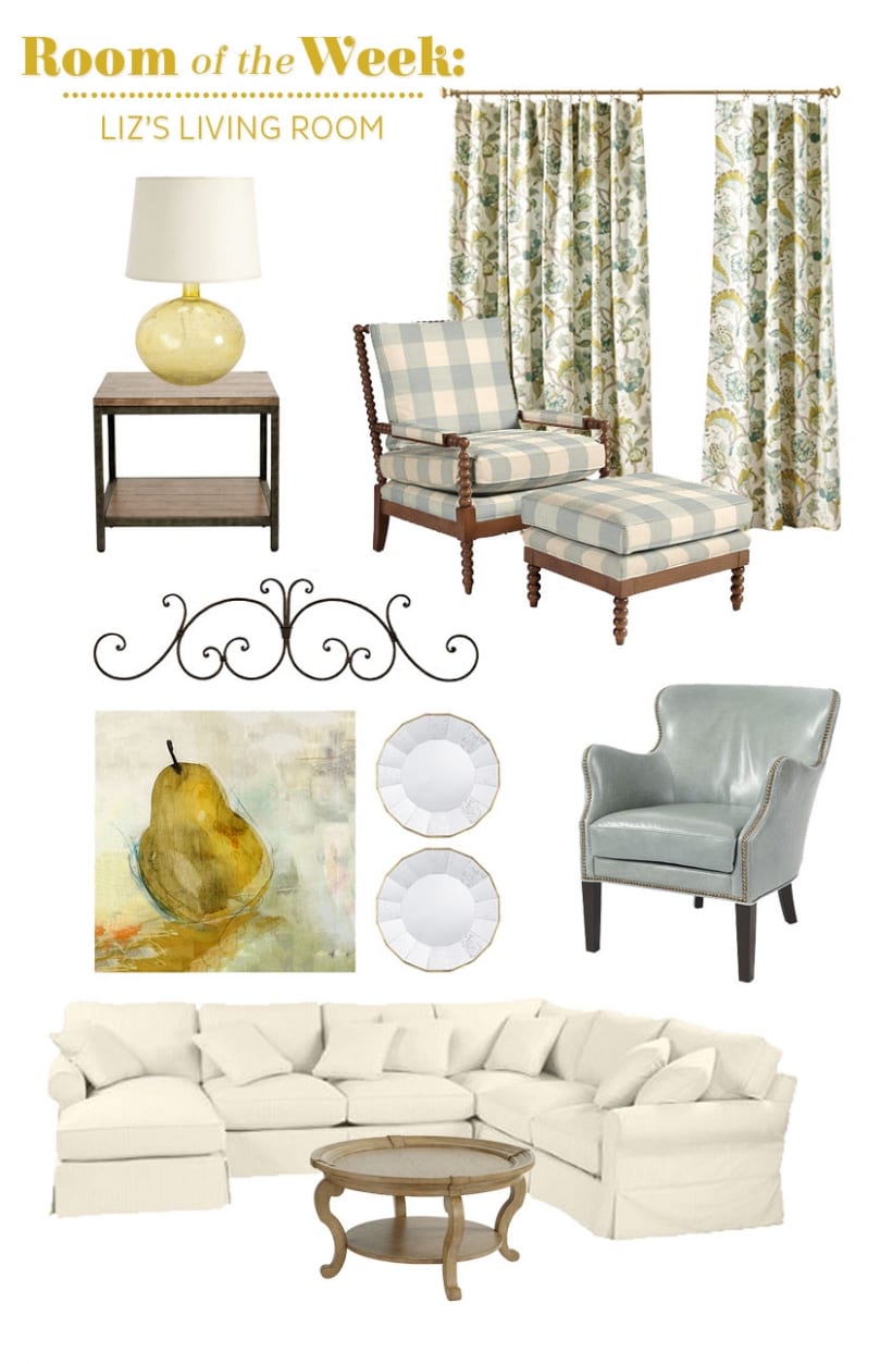 Having a great rug is the perfect place to start because it creates focus in the room and gives the opportunity to add interest and visual text below all the major furniture pieces. We suggest our Monroe Hem Rug. Top that with our Baldwin 4-piece sectional. A sectional is the ideal seating solution for a busy area. It is extremely comfortable, and it’s easy to care for since it is slipcovered. We suggest a slipcover in Quilted Off-White. Add throw pillows for color. The art we collected for your space is Golden Pear Art, two Bellesol Mirrors, and our Natalia Iron Plaque. Front the sectional with a Carrington Coffee Table in rustic pine and then a Durham Square End Table will give the right amount of places for drinks, books and remotes.