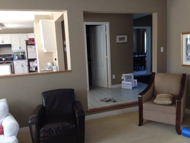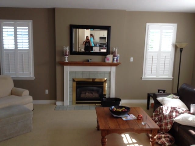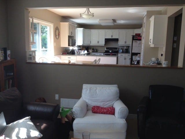 We have lots of windows, a fireplace and a half wall to work around. I would like to create a relaxing and intimate gathering area that maximizes seating and add a TV that can be viewed by any guests hanging out in the kitchen area.