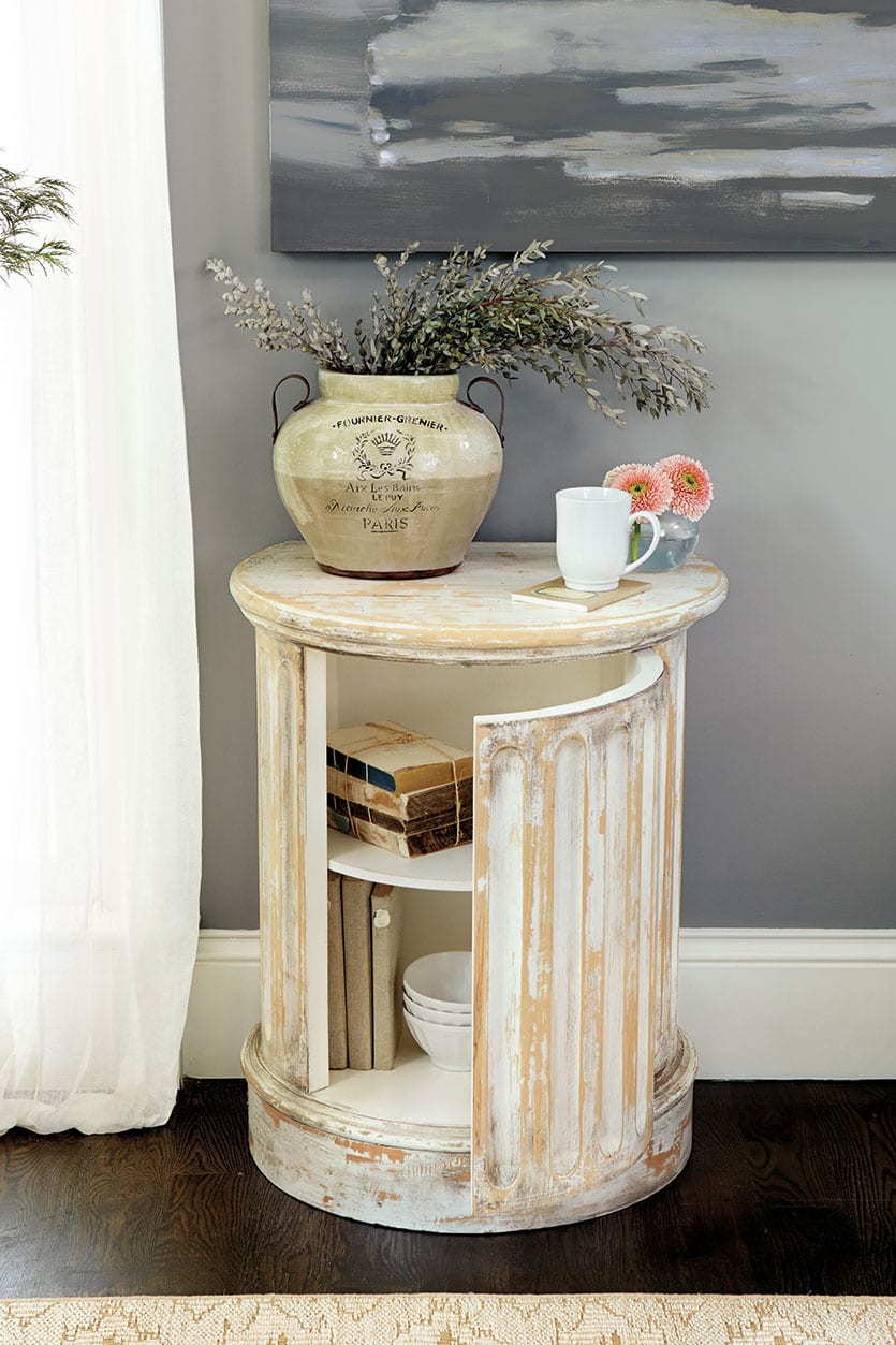 It’s an architectural statement that’s also a side table. Every fluted piece is a separate piece of wood that has been carved by an artisan, then pieced together by hand to create this round column. There’s no other way to construct it. And then you’ve got this invisible door for hidden storage. To me, it feels very modern. Of course it’s super classic, but I could see it in a very minimalistic house.