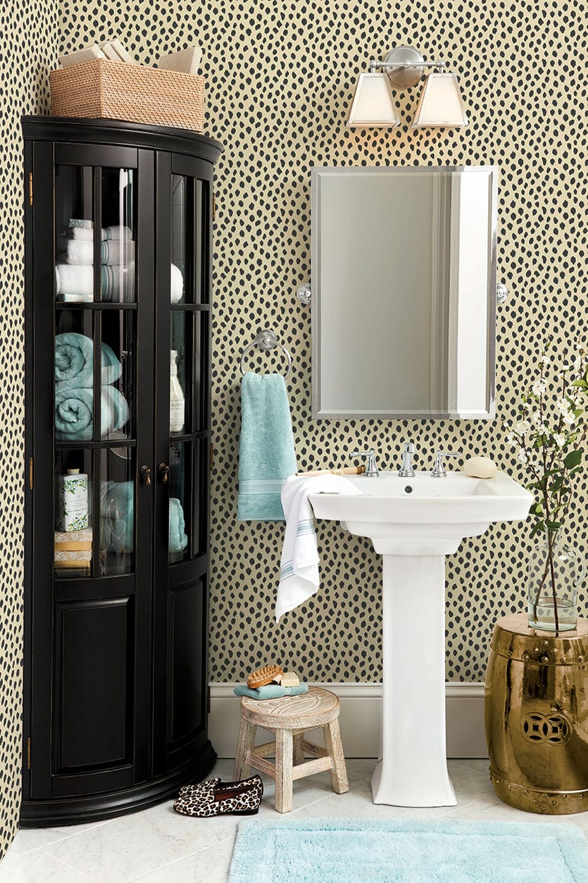 The great thing about a powder room is you can go over the top with a lot of personality in that little bit of a space. That’s exactly what this is for — to be used as an accent. It would also be great in the back of a bookcase or even an open shelf. Just use double stick tape to secure it to the back of the shelf.