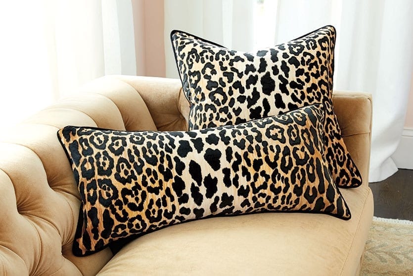 It’s bolder. Our cheetah that we’ve had forever and is considered a basic of ours is an allover print. This really has kind of a striped pattern and it’s large scale with a bit of airiness to it. You’ve also got a couple of different colors in the background, so it’s going from a lighter to a darker shade. I have to admit, when I initially saw the fabric, I thought, “Oh, this is too much.” But then I saw it upholstered on some of our pieces and I was in love. It looks so great on anything. But you don’t need a lot of it, so if you don’t want to walk too much on the wild side, just do a pillow. The ottoman in this room could easily be white and the room would still have that punch with the two throw pillows.