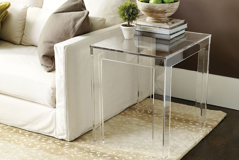Yes. The core principal of the Ballard aesthetic is mix. You find the things that are beautifully designed that you love and you put it together — and that’s what Ballard is. These are beautifully designed, simple tables. And, really, it’s a very classic look that happens to be very in style right now. In my opinion, it never went out of style. You could say these pieces are on trend, but they’re not trendy. If you love the look, these tables will appeal to you today and always. And if you have a small living room, these pieces are great. Acrylic cuts down the visual clutter. Plus, you get to show off your fabulous rug.
