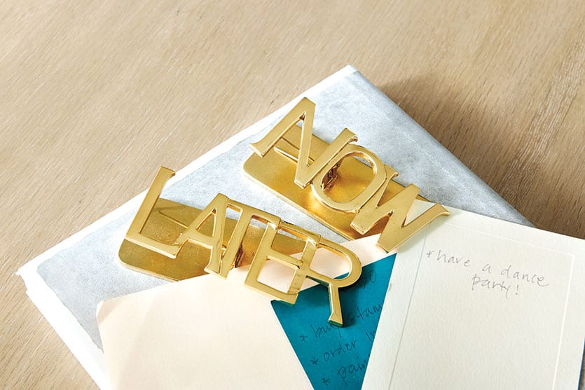 Our super fun, incredibly chic Brass Organization Clips let you organize your papers and files into two categories: now and later. “Now” items may include permission slips, bills or party invitations. As long as you stay on top of these items every day or two, you’ll minimize your to-do list and limit visual clutter. Once a week, revisit your “Later” items and take action when you can. These items might have longer lead times, like tax documents or a catalog with something you want to buy.