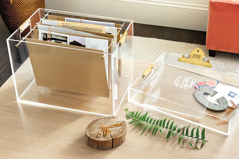 We like to think our Livy Office Accessories suit the needs of both “pilers” and “filers.” People who tend to pile papers on their desks typically need that visual reminder to deal with those to-dos. And if you like everything in its place with minimal desktop clutter, you’re a filer. Our clear acrylic File Box and Tray neatly corral action items in plain sight, killing two birds with one stone. The Livy Clipboard lets you take notes and secure papers when you’re on the go. A bonus? You can monogram any of these items!