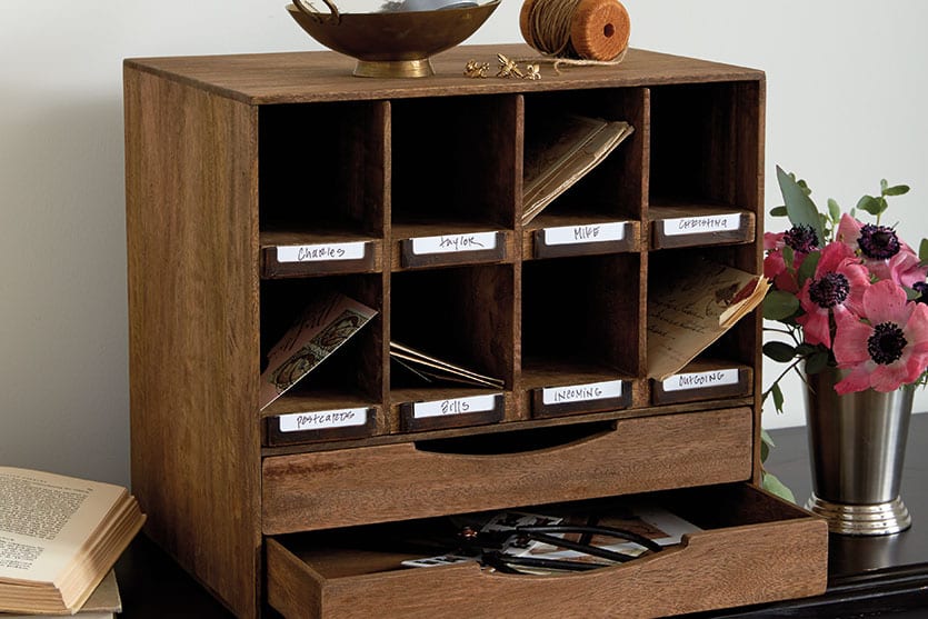 Say goodbye to the junk drawer. With our Vintage Entryway Organizer, you can create a cubby for everyone’s everyday stuff. It’s compact size means it easily fits atop a console, kitchen counter or desk. Labels let you assign cubbies for specific items or to family members. And you can use the drawers below to store writing supplies, to-go menus, keys, chargers and more.