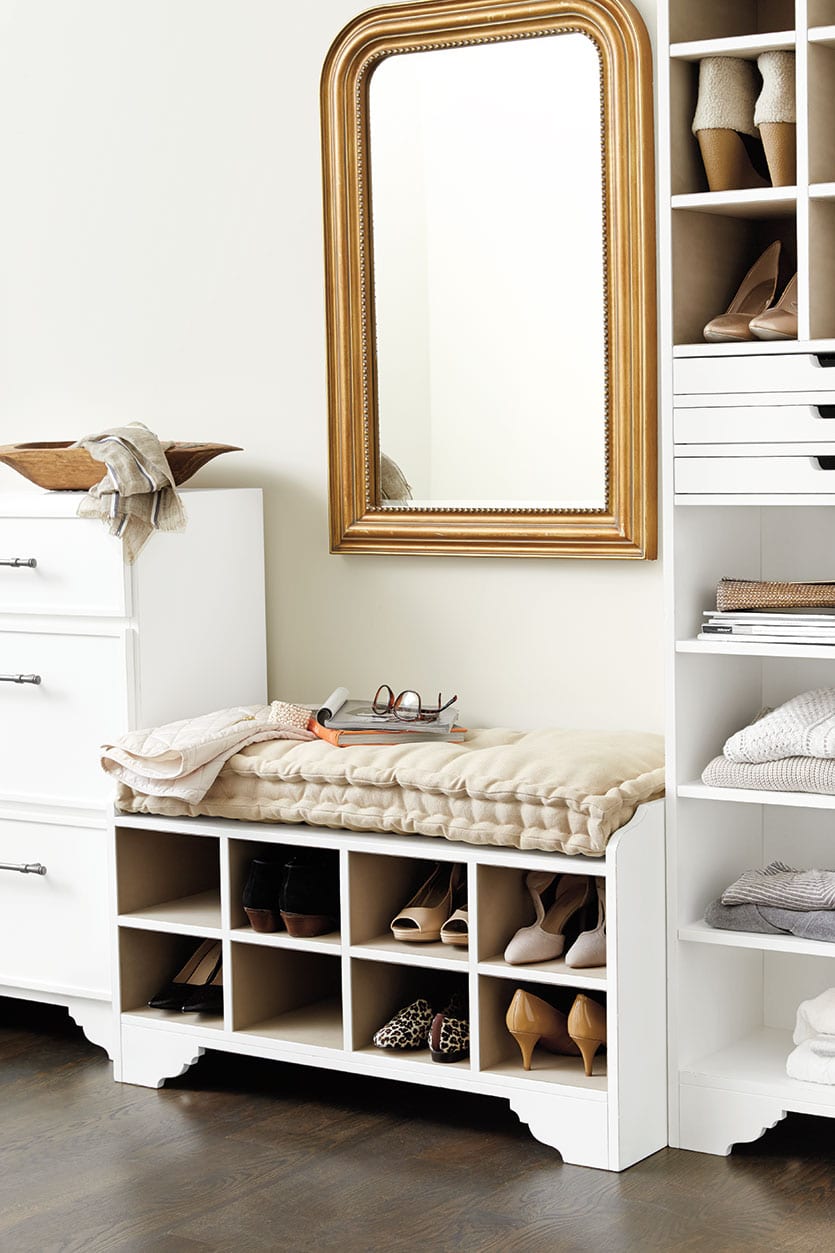 The newest addition to our Sarah Storage Collection, this versatile Bench goes anywhere. Create a pretty perch in the dressing area or at the foot of a bed with storage beneath for your shoes. The cubbies are lined in soft, pale gray fabric, so they protect expensive footwear. It fits our Farmhouse 2-Seat Bench Cushion, so you’ll always have a comfy place to sit while you’re pondering what to wear.
