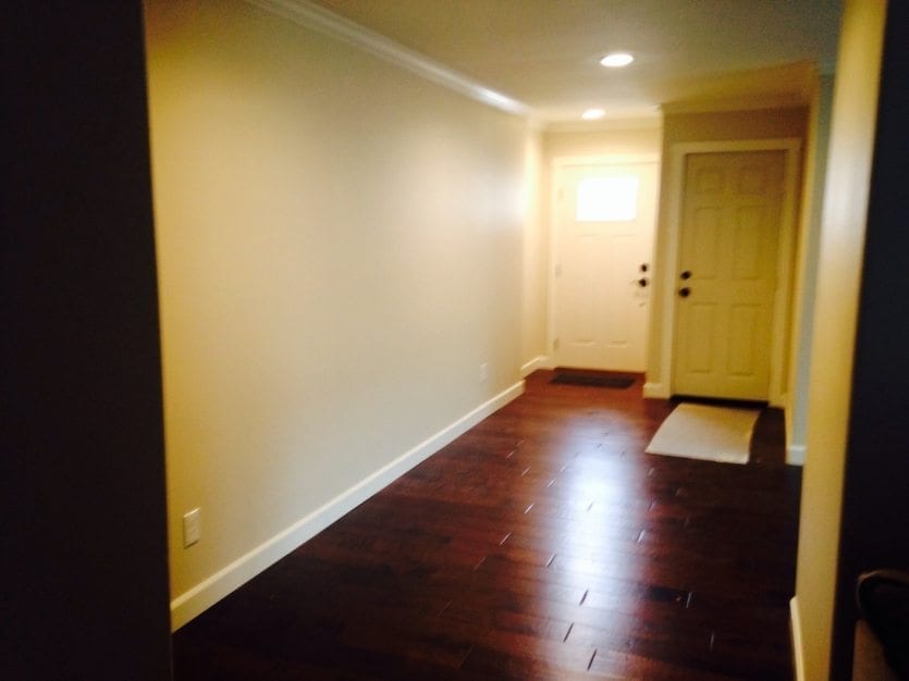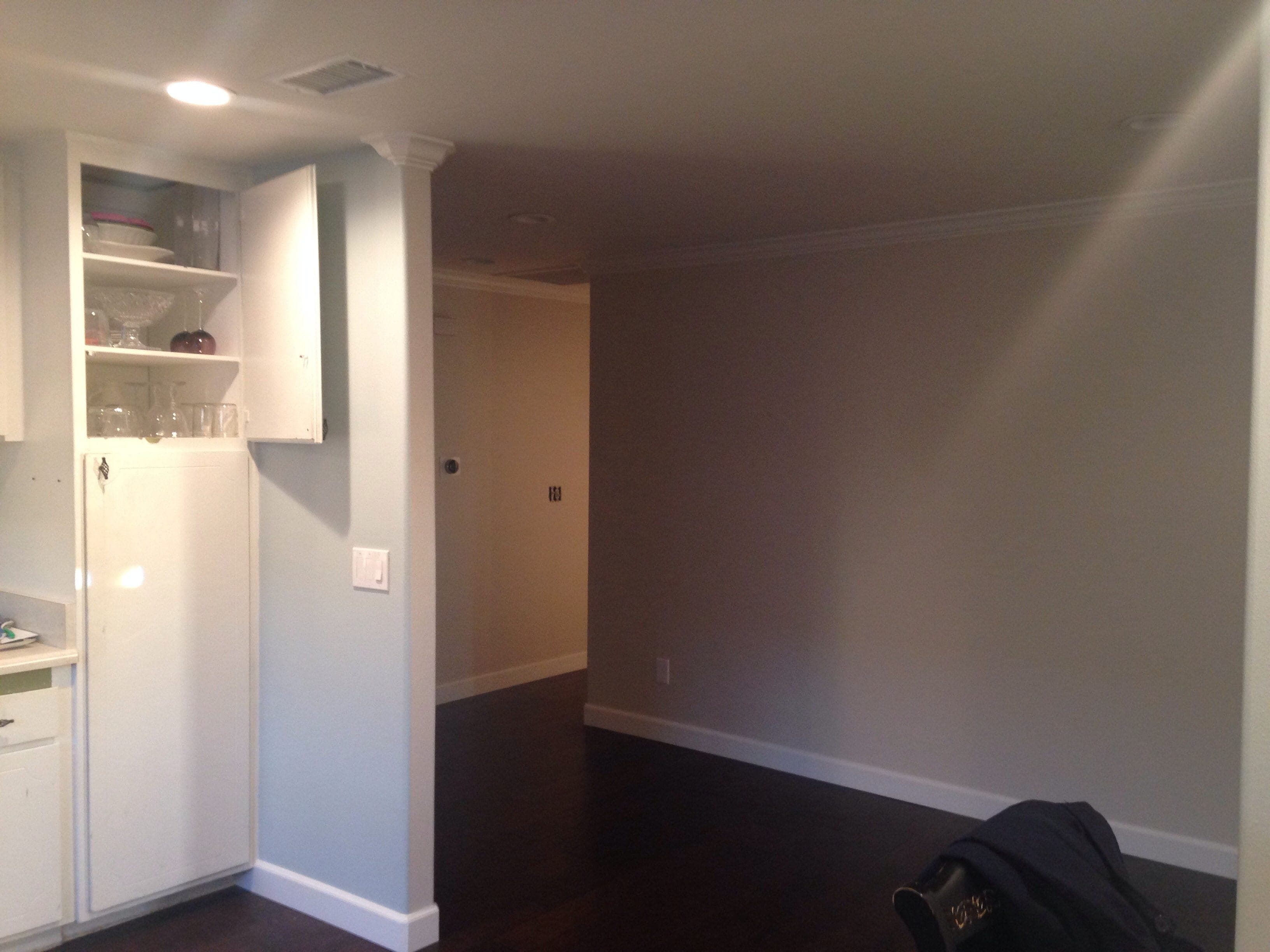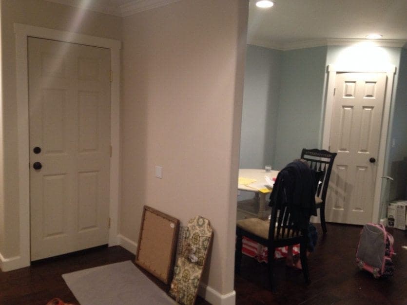 Your foyer is a spacious area. Let’s pull in blue, from the kitchen, onto the long wall by painting a wide strip of a blue whisper. This will define the wall space and create a focal point.