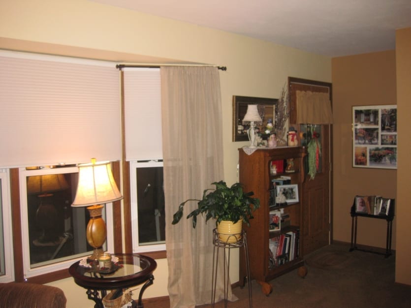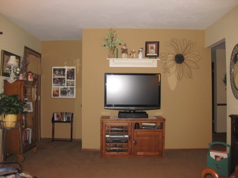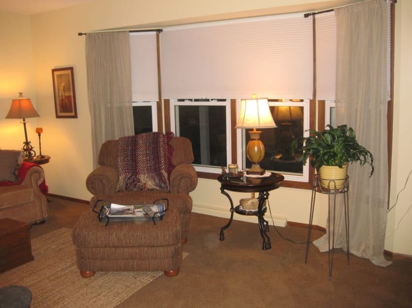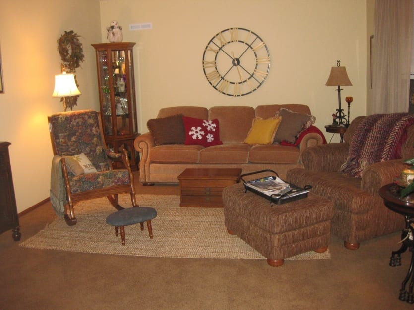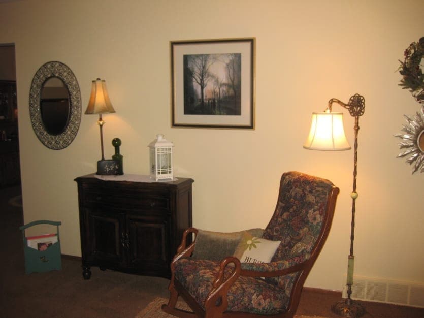 I’d like to replace the brown chair and hassock with a new comfortable chair. I like to put my feet up! The little cupboard in front of the 88″ couch should be replaced with a coffee table; a piece of wall art for north wall is needed; different rug or lamps can be replaced.