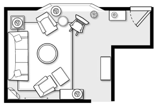 Let’s start with the furniture arrangement. You actually have a workable floor plan. We like that the room looks inviting as you come in the door and that the television is not the first thing that you see. We believe your biggest problem comes from the scale of your comfy chair. It is just too big for the space, which throws off the balance and flow of the room. With the addition of a few key pieces, we can update and make your room functional and beautiful.
