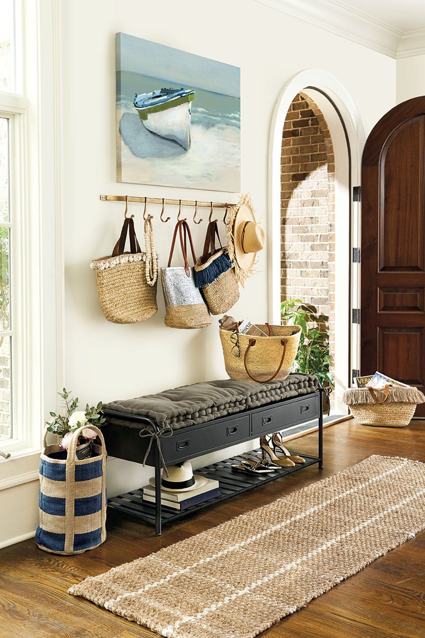 I have an obsession with tote bags. I cannot have enough! They each offer something different, and we have an amazing selection. You’ve got the metallic touches, the fun fringe and pom pom detail. Of course I use them for little trips or take them to the beach, but I really think it’s a fun way to manage yourself. I use them as a filing system. I’ll keep one by my desk at the office for things I need to take home that day and one by my sofa at the house for when I’m flipping through magazines and I find great ideas for work. I can just throw them in there as opposed to having stuff all over my coffee table. Then I can just pick it up and take it to work. I love using totes as my catchall — they’re an easy way to corral and organize the little things that can get out of control so quickly.