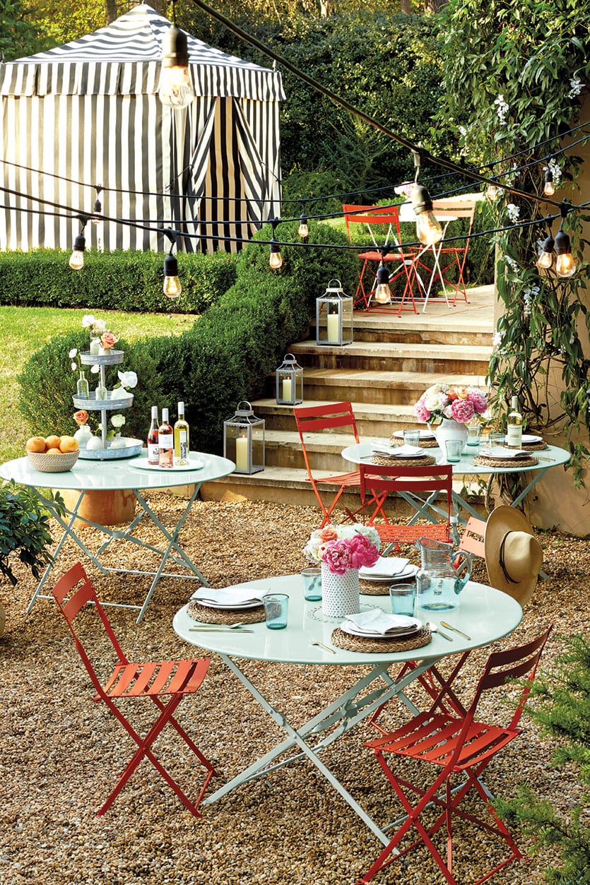 KM: It’s no secret we love Paris. Who doesn’t? Our bistro-style tables and chairs were inspired by the sidewalk cafes in Paris and let you recreate that look in your own backyard. The pieces fold up for easy storage, so they’re great for entertaining. I’ve had the table and chairs in black in my backyard for years and they still look great. We’ve updated the collection this year with our favorite pop of coral. We’re loving the look of mixing the colors — and the striped cushions adds that extra twist.