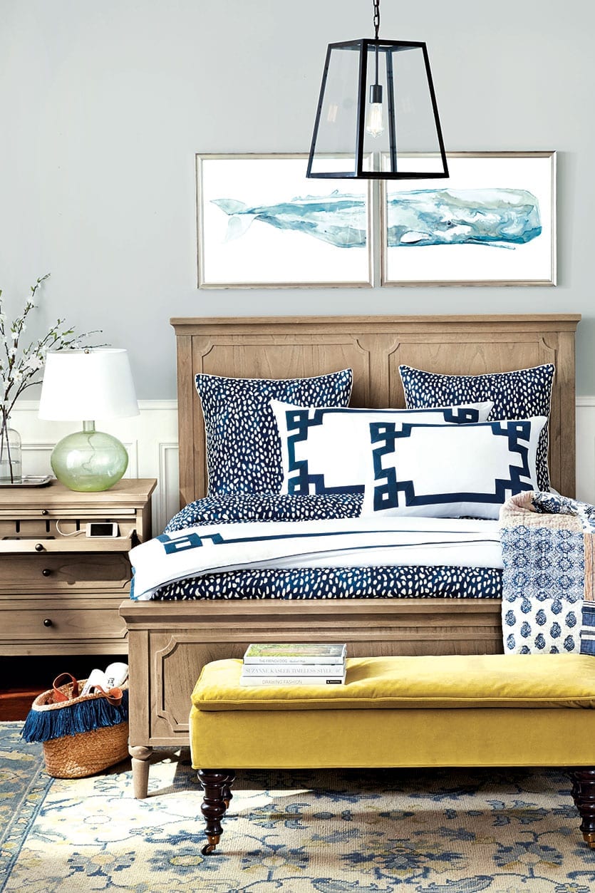 And in this bedroom, we put Soho Velvet Lemongrass on the bench and paired it with our painterly navy and white bedding. It feels so alive, which is exactly what we want this time of year.