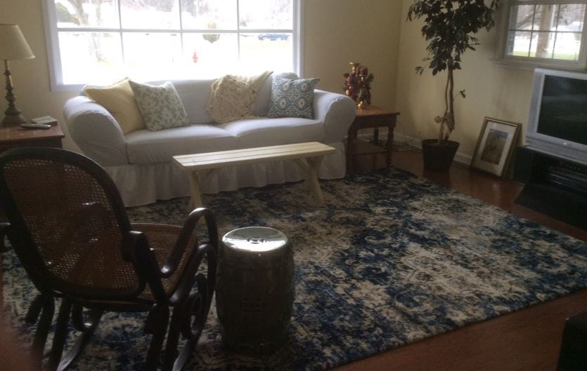 I love the new clean, bright feeling and want to follow with that in my choices of furnishings and decor. I bought a cotton duck, ruffled slipcover for my old sofa because it’s still in great shape and very comfortable. After months of searching, I bought this area rug. With Caroline’s decorating help, the Slim Chadwick Armoire in Rubbed Black is on its way and will house a new flat screen TV!