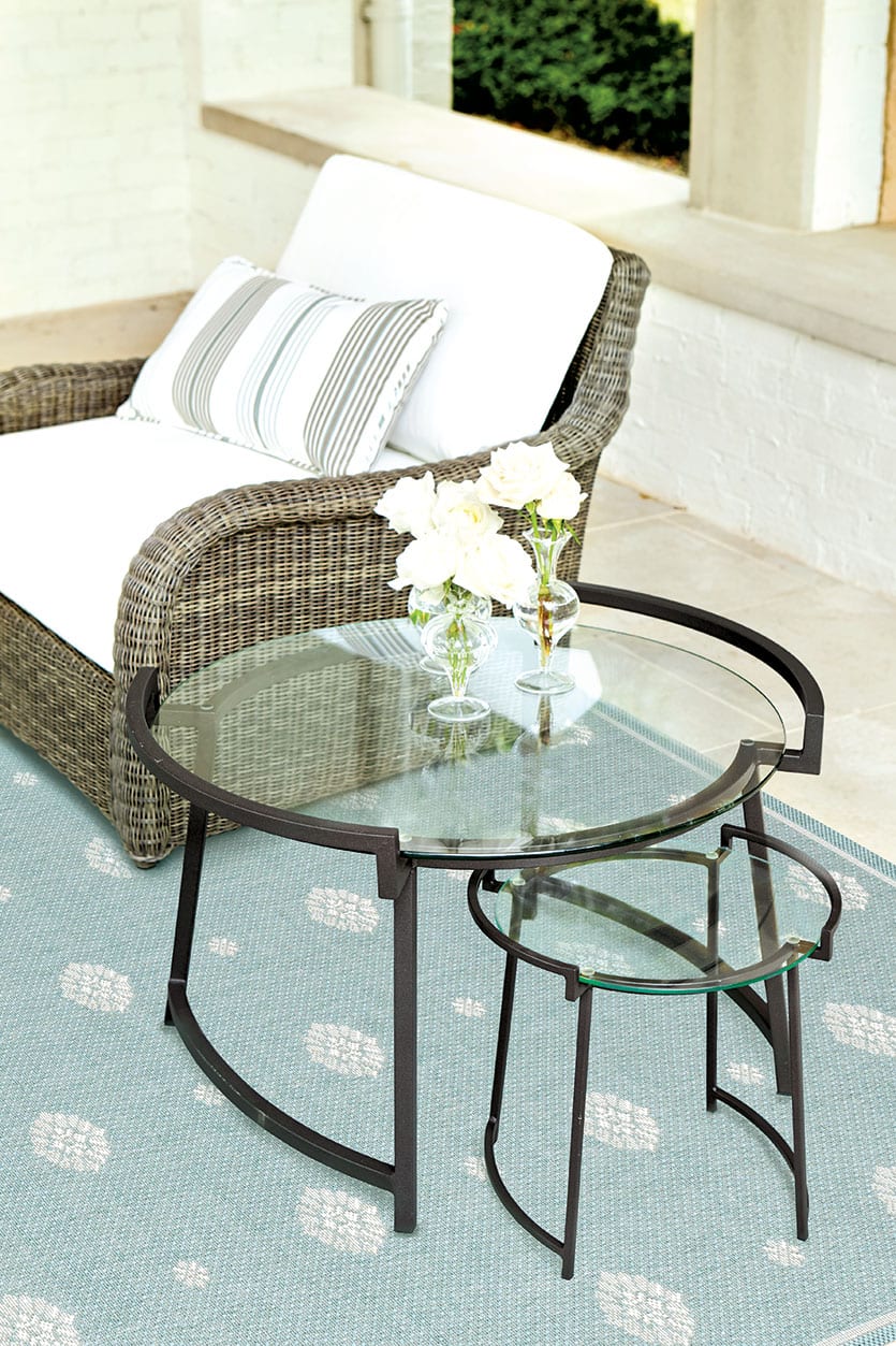 SK: The funny thing is, I found the original vintage table in orange. It was painted this bright orange, and I thought it was so fun and appealing. It also comes in a dark chocolate and white finish. It has this great shape with a glass top, and it’s easy to move around, so when you go over to your lounge chairs, you can bring the table. You need little tables like this, so you always have a place to put your iced tea or book. And like I said, they mix in so well with everything else.