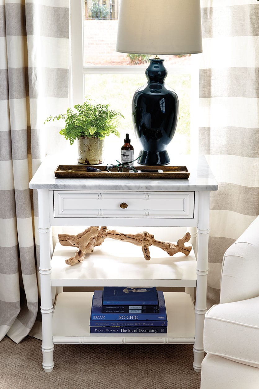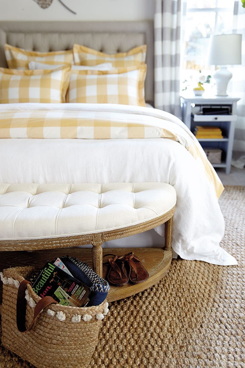 If you have a small bedroom, consider using a bench at the foot of the bed with rounded corners. It’s easier to walk around, and even though it’s a small difference in size, it makes a big difference in the flow of your room.