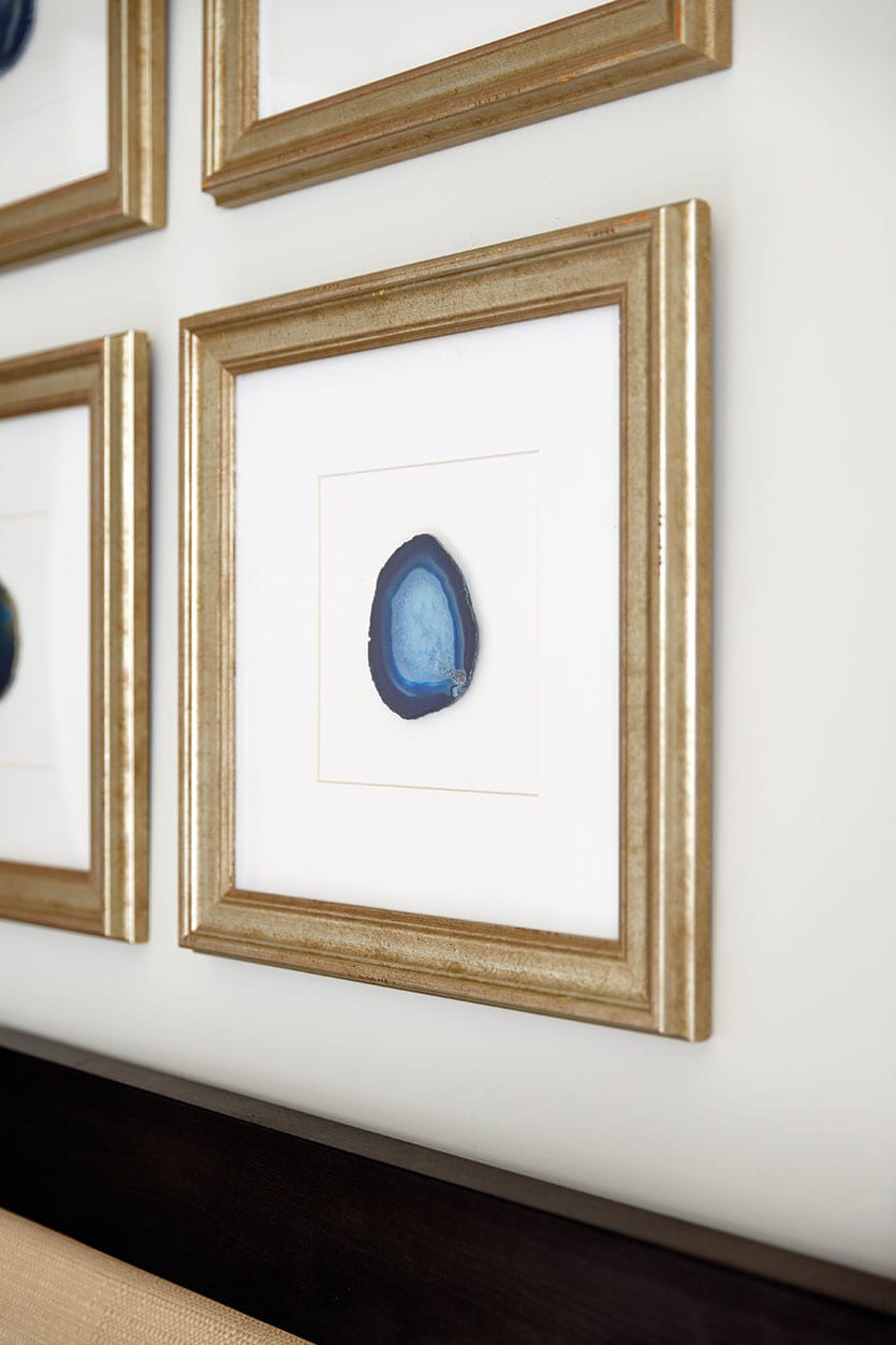 Framed cross sections of real agate, in the most striking shade of dark blue, are framed in a grid over the bed. We love the way these sliced pieces stand out from the backing, creating texture and dimension.