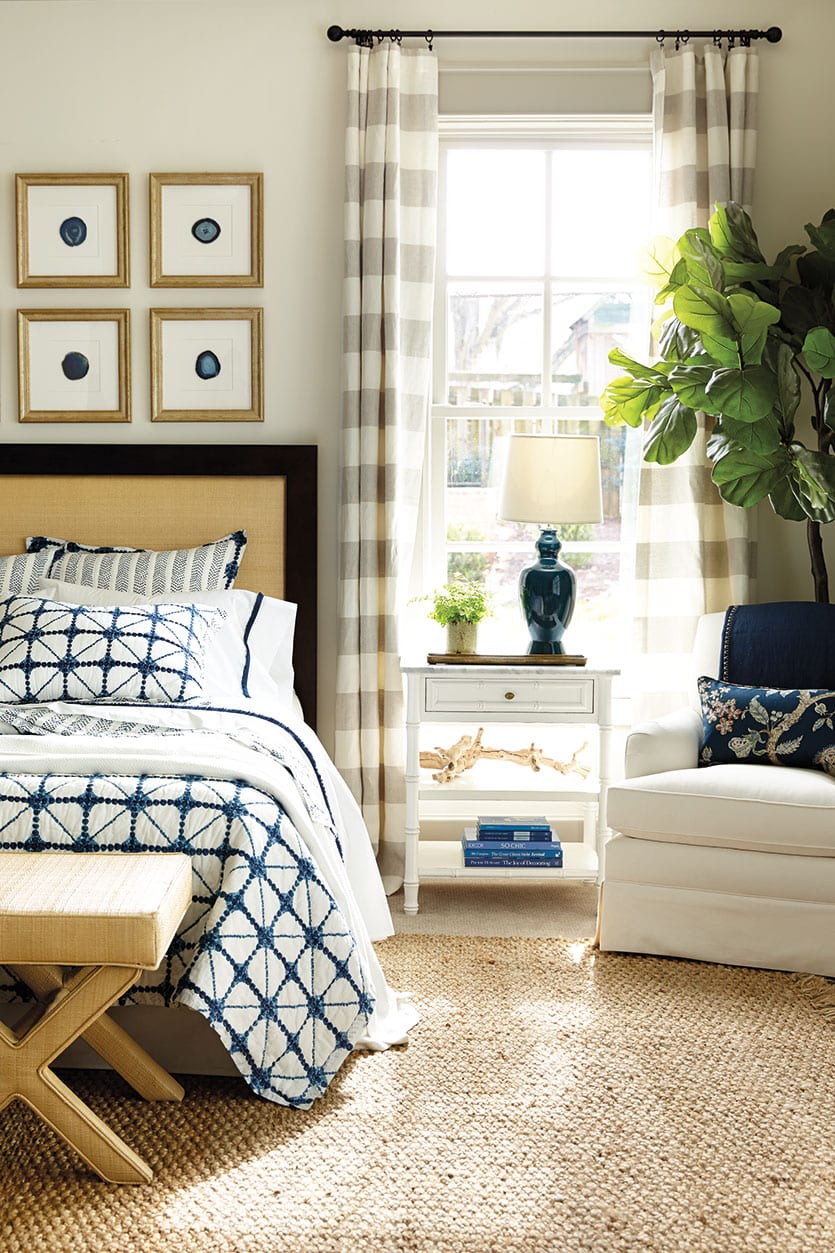 For a slightly more bold look, we brought in accents of indigo! The whole space was inspired by our new Milos Quilted Bedding which has the most beautiful dark blue color and a shibori-style pattern. We paired it with sandy neutrals, like a headboard with a raffia upholstered panel and an X-bench upholstered in our raffia fabric.