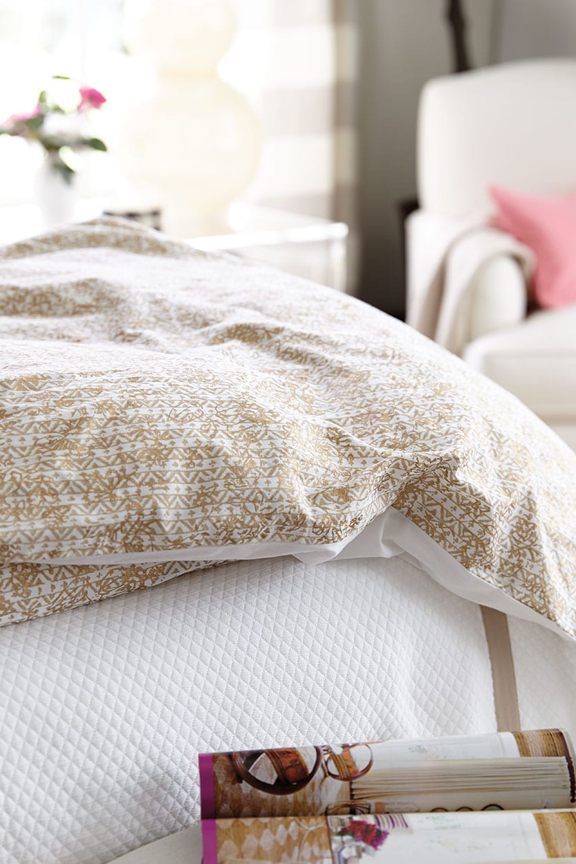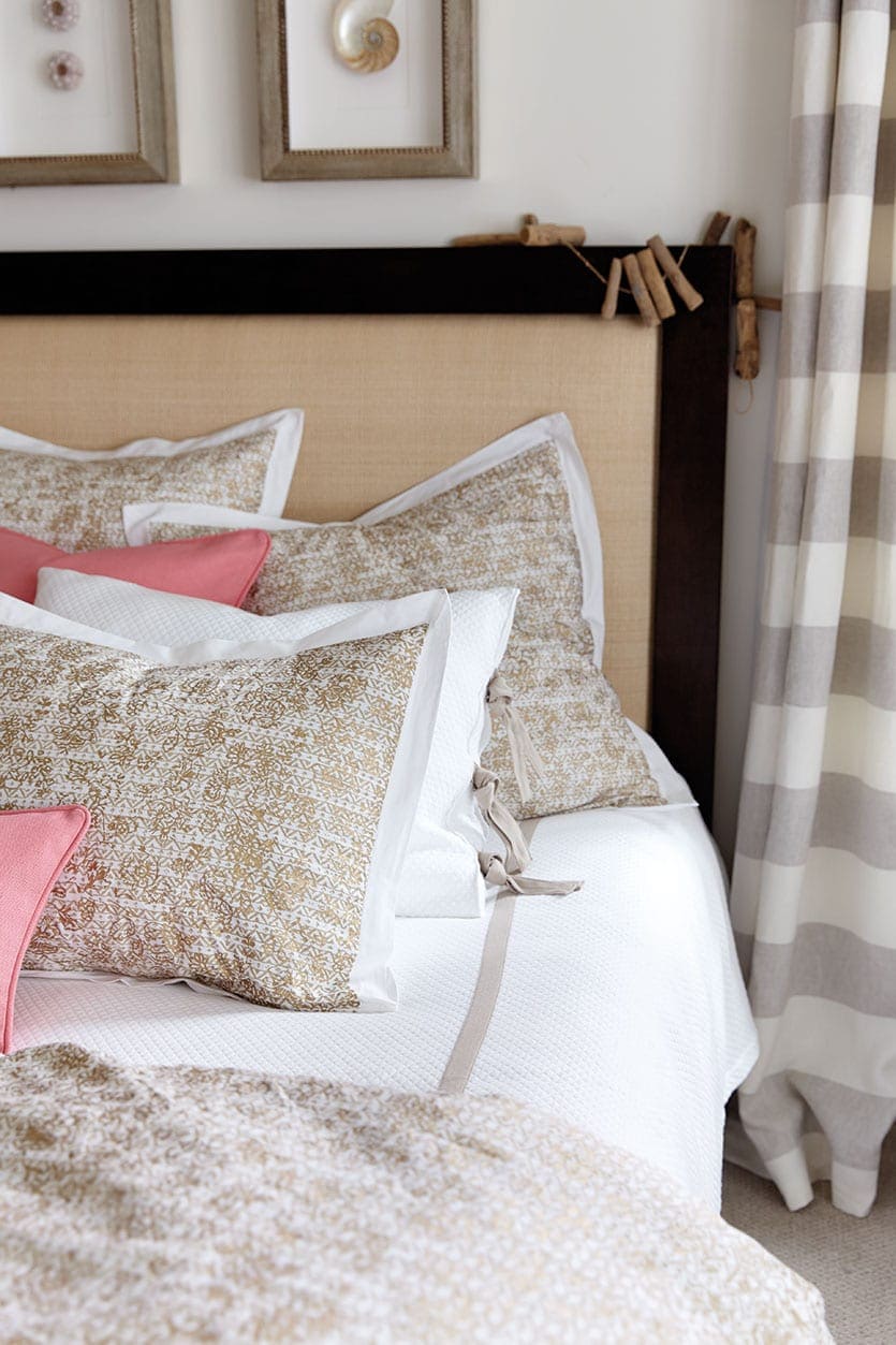 Bedrooms are a great place for a neutral color palette because you want them to be a place of rest. That doesn’t mean, however, your neutral pieces have to be boring. In this bedroom, all of the large elements are neutral, but they all have something special about them. Take the bedding we used. We paired our L’Hotel Matelasse in Natural with Suzanne Kasler’s new metallic Alain Collection in Gold.