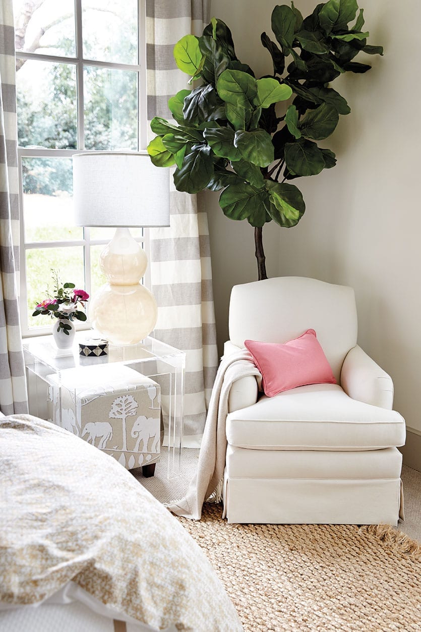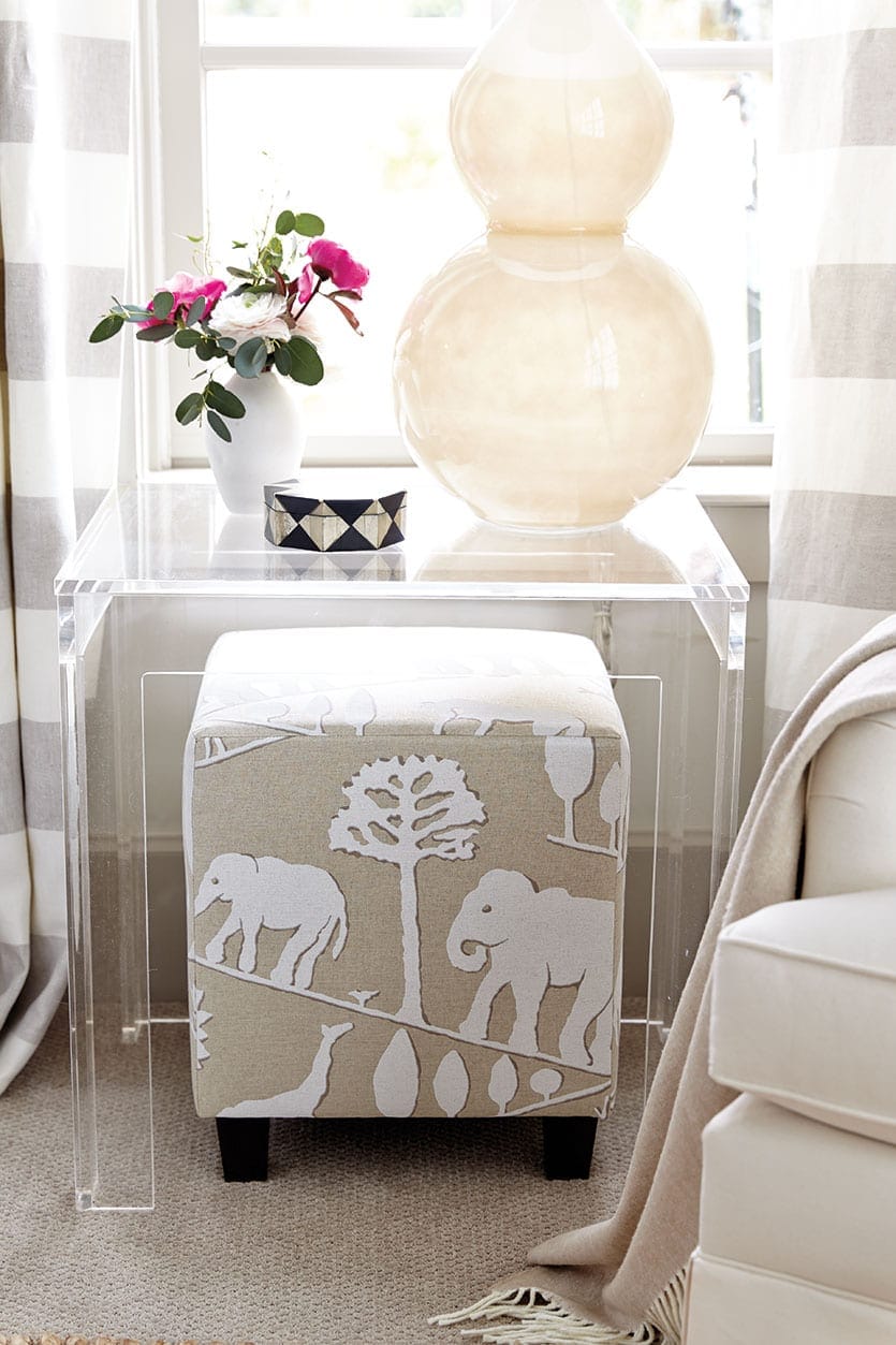 For the nightstand, we used an acrylic side table with an upholstered cube tucked under. Acrylic is definitely an unexpected choice for a bedroom, but it makes this space feel super chic and fun, despite being mostly neutral. And of course our Nairobi Flax pattern is a whimsical touch!