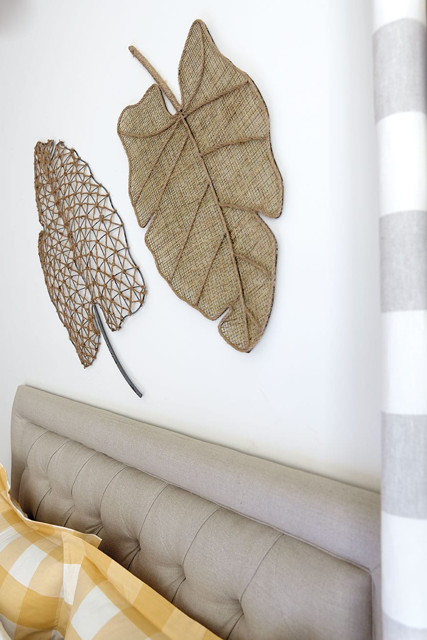 We believe in putting something bold over your headboard to create a focal point in the room. Our new Jute Leaf Plaques are the perfect accent for this happy bedroom.